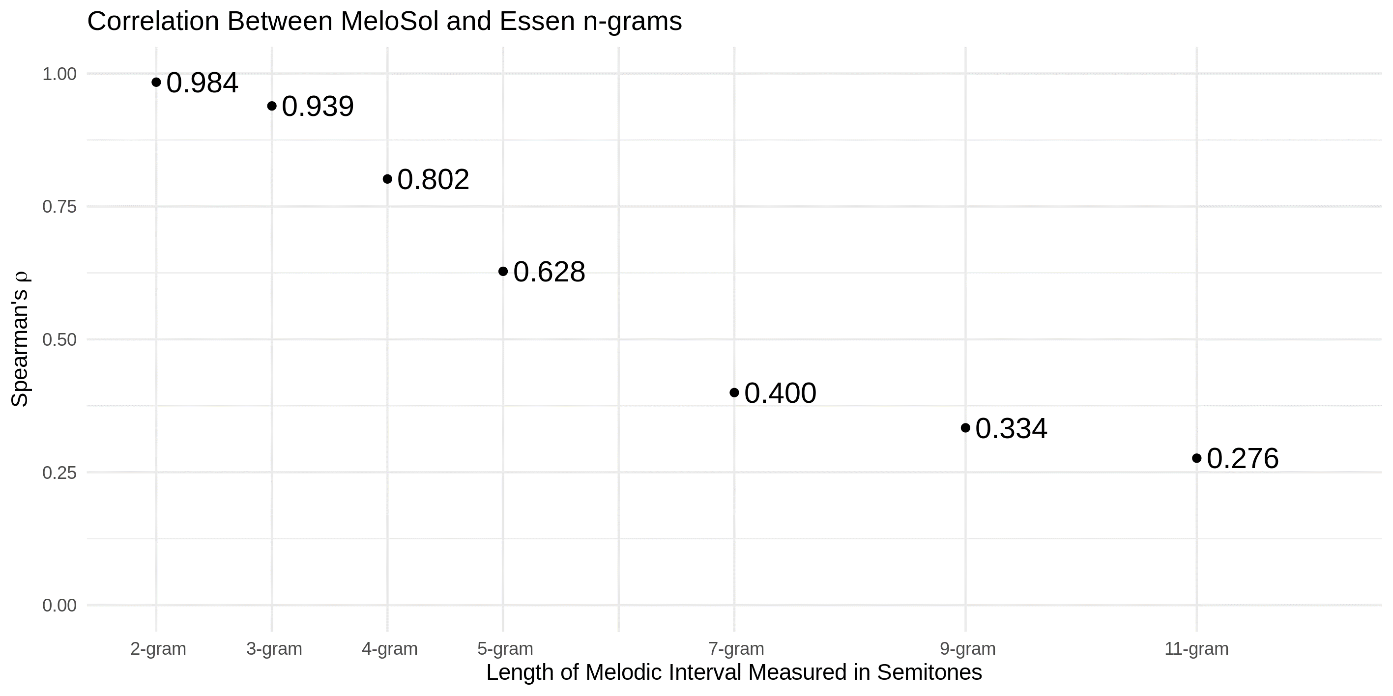 The similarity of intervals as indicated by the relative close proximity of pairings from each bigram suggests a high degree of stability given shorter transitional probabilities. In order to explore how the frequency of n-grams breaks down as a function of length of n-gram, Figure 6 plots the Spearman correlation coefficient reflecting the relationship between the ranked frequency of each size n-gram. For example, moving beyond a bigram that would just comprise two notes (one interval), a 4-gram would be a string of absolute consecutive intervals generated from five notes. Even at the 4-gram level, the Essen and the MeloSol corpora are strongly correlated at ρ(1402)= .802, although this pattern breaks down with longer n-grams. Scripts to reproduce these analyses can be found in the corpus repository.