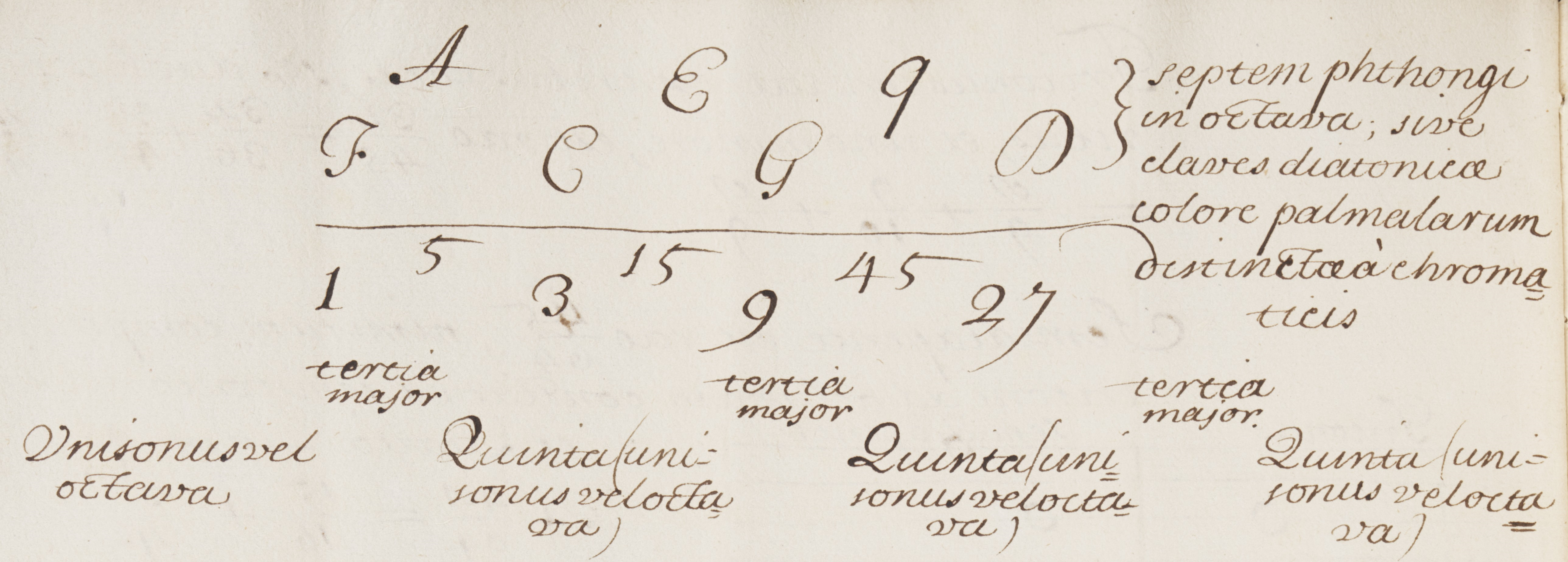 Figure 1a. Mercator's two-dimensional representation of the syntonic diatonic scale, together with the corresponding numbers composed of prime powers of 3 and 5 below the horizontal line - neglecting the octave information (Mercator, MS MUS. 1187 fol. 11v, by permission of the Christ Church Library, London)