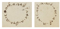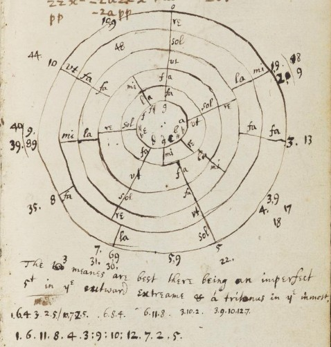 Figure 1b. Newton describes syntonic scales through three kinds of semitones, the diatonic semitone a, the greater chromatic semitone b and the lesser chromatic semitone c, which he arranges on an octave circle (Newton 1665, fol. 110r).