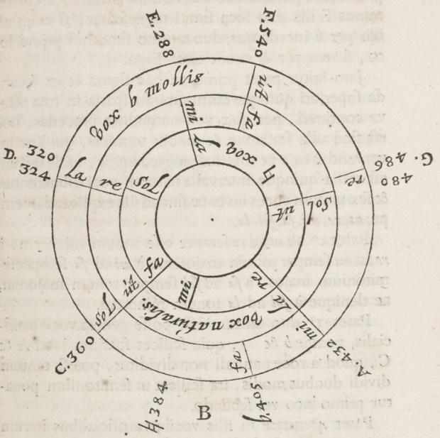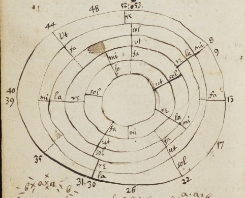 The use of concentric rings to visualize hexachordal tone systems has a very early forerunner in Theinred of Dover (Ms. Bodley 842, mid-twelfth or early fourteenth century), where four hexachords are represented on a circle that closes after two octaves, see Figure 2b 17 Theinred's visualization was probably not known to Descartes, and almost certainly not to Newton. Descartes, however, was at least superficially familiar with Zarlino's theories from his college education at Flèche 18. Zarlino's Sopplimenti musicali contain a diagram, which could have been a source of inspiration for one of Descartes's circular pitch diagrams, Zarlino (1588, Libro Ottavo p. 296). Newton in 1665 certainly knew either the English or more likely the Latin edition of Descartes's Compendium musicae, when he investigated musical scales.