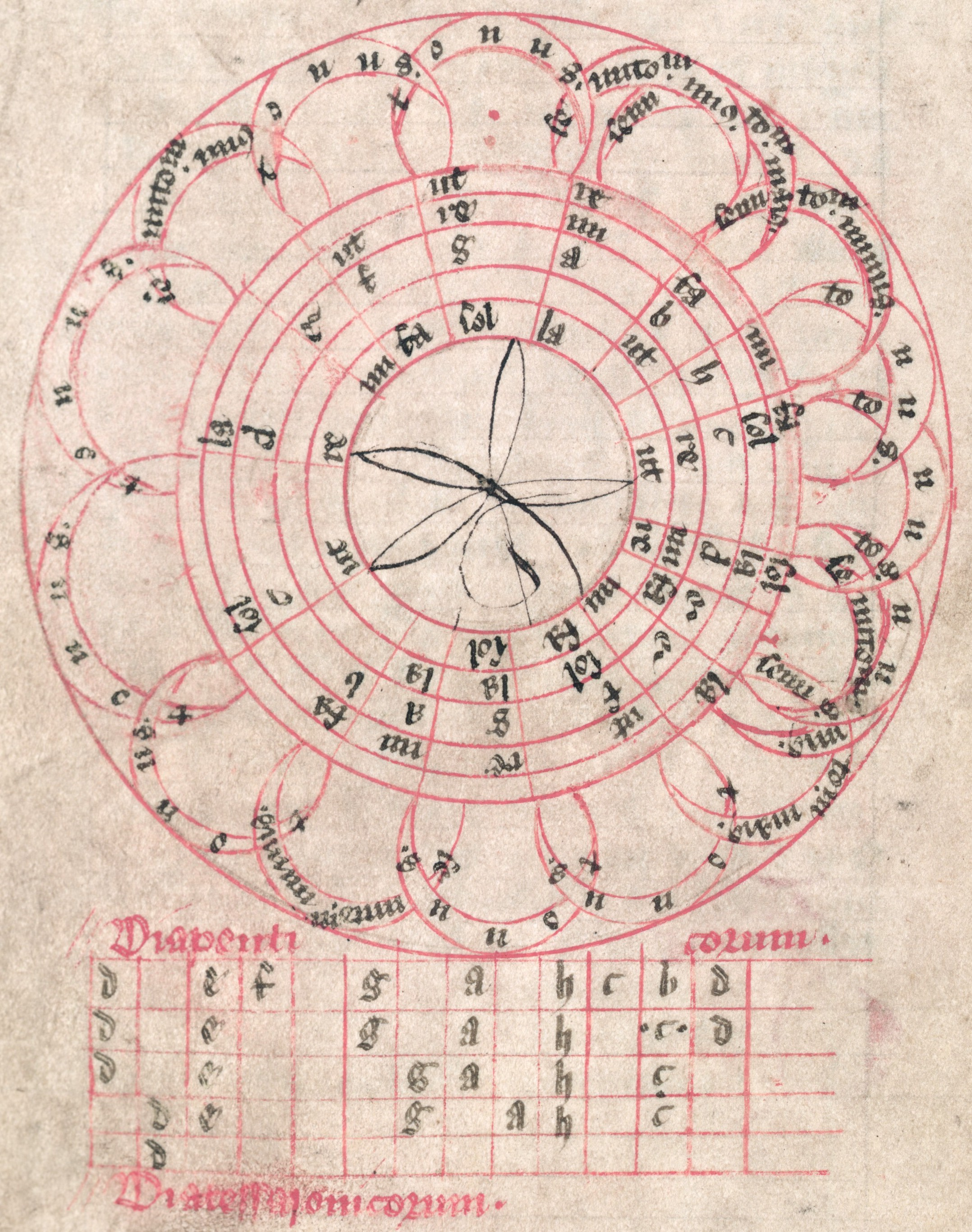 Figure 2b. Theinred of Dover's hexachords on a two-octave circle with four hexachords on ut = B♭, F, C, G together with an interpretation in terms of a 12 semitone note frame without F♯. The tuning is not specified, so that the diagram is compatible with Pythagorean as well as 12-EDO tuning, depending on the interpretation of the Tonus and Semitonium. (MS. Bodley 842, fol. 80v)