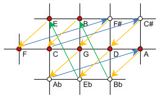 Figure 3a. Newton's syntonic chromatic scale in a rectangular pitch grid as a closed vector path. The notes (pitch classes) of the C-major scale are highlighted. The G-major scale is congruent with the standard diatonic major scale as described by Mercator, see Figure 1a.