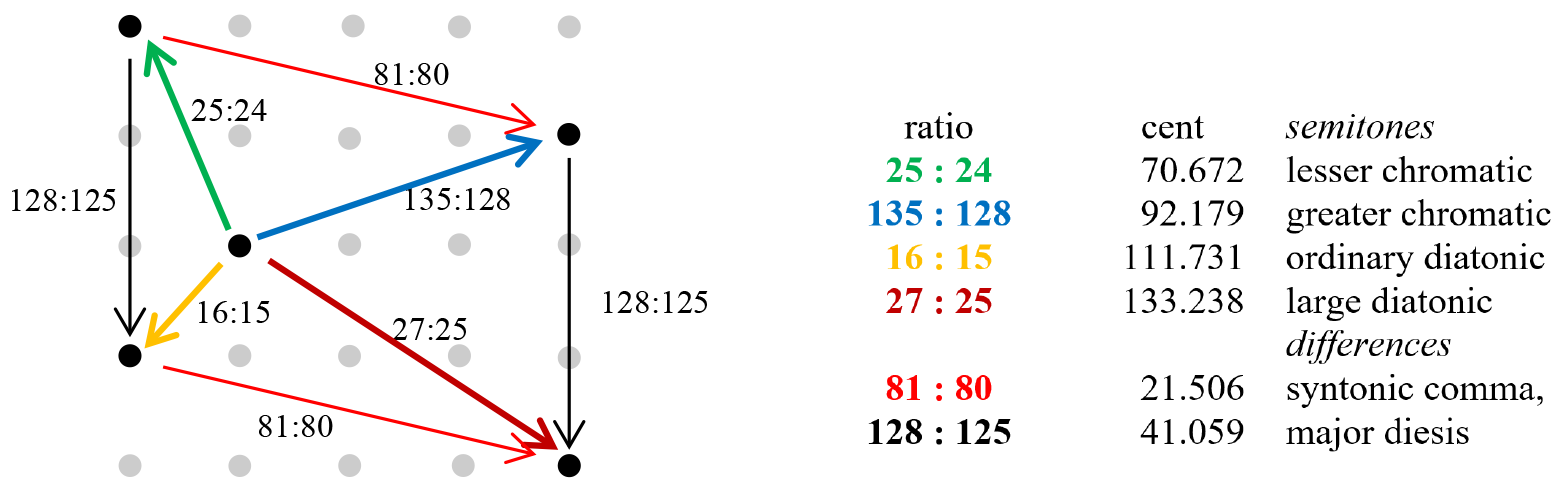 Figure 4. Vector representations of the four kinds of semitones occurring in limit-5 tunings. The lesser and greater chromatic semitones, as well as the ordinary and large diatonic semitones, differ by syntonic commas; the lesser chromatic and ordinary diatonic semitones, as well as the greater chromatic and large diatonic semitones, differ by enharmonic changes or major diesis (128 : 125) – an octave minus three just major thirds.
