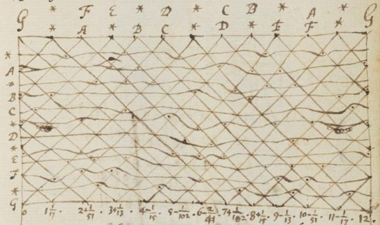Figure 6a. The curves in the central part analyze all the intervals of the chromatic scale, whether they are greater or smaller than the corresponding intervals with respect to G. Newton (1665, 108r) 23.
