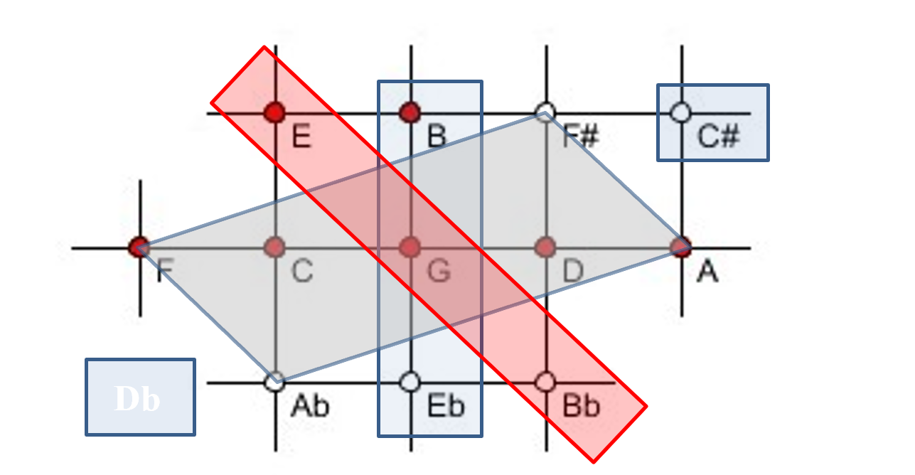 Figure 7. The 612-EDO pitches of the notes described in Figures 6a/b correspond to pitches on and within the parallelogram F-A♭-A-F♯. The pitches D♭, E♭, G, B, C♯ fit to 615-EDO.