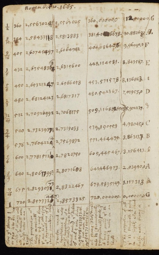 Figure 8. Newton gives base 10 logarithms of the intervals of the syntonic chromatic scale (3rd column). The last number column expresses these intervals as multiples of 12-tempered semitones with an accuracy of 0.0001 cent. Newton (1665, 105v)