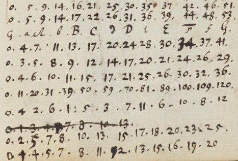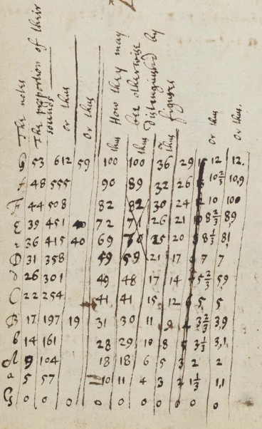 Figure 9b. It is unclear how the almost regular pattern in the fourth row from the bottom (0 4 2 6 1 5 3 7 11 6 10 8 12) is related to the divisions of the octave. Newton (1665, 108r)