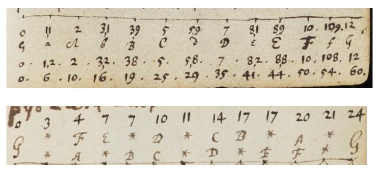 Figure 9c. Above: Two versions of 120-EDO with semitones of the sizes 11, 9, 8 resp. 12, 8, 6 units, the latter are equivalent to 6, 4, 3 in 60-EDO. Newton (1665, 106r). Below: A 24-EDO representation with a lesser chromatic semitone of size 0. Newton (1665, 108r).