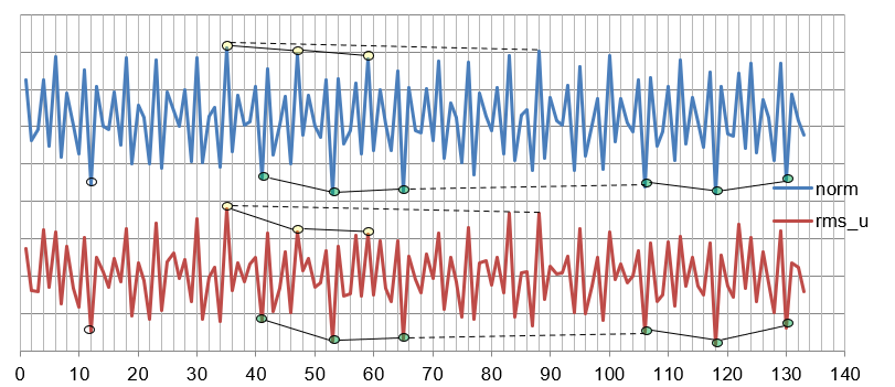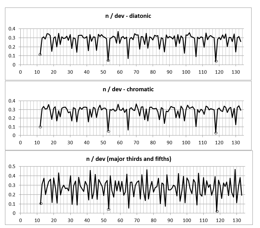 Figure 14. The diagram shows the Euclidean norm (above) of the combinations n = x ⋅ 612 + y ⋅ 118 + z ⋅ 53 and the root mean square deviations of the corresponding consistent n-EDO representation from the syntonic chromatic scale for values of n < 134. Pronounced maxima and minima are highlighted. Maxima correspond to weak and minima to accurate approximations 39.