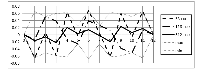 The two curves in Figure 14 show that the Euclidean norms d = of n = x ⋅ 512 + y ⋅ 118 + z ⋅ 53 (norm: blue) and the deviations of their n-EDO representation from the syntonic chromatic scale (rms_u: red) form very similar patterns. This means that the coordinates (x, y, z) explain the quasi-chaotic dependence on n of the deviations to a wide extent. Both graphs have pronounced minima at 12, 53, 53 ± 12 as well as at 118, 118 ± 12. Some of the strong maxima (indicating inaccurate approximations) occur at 47, 47 ± 12. Recall that 118 = 2 · 53 + 12 = 65 + 53 = 2 · 59 and that the poor 59 (rejected by Newton, see Figure 9a), is exactly in the middle between the pronounced minima at 53 and 65.