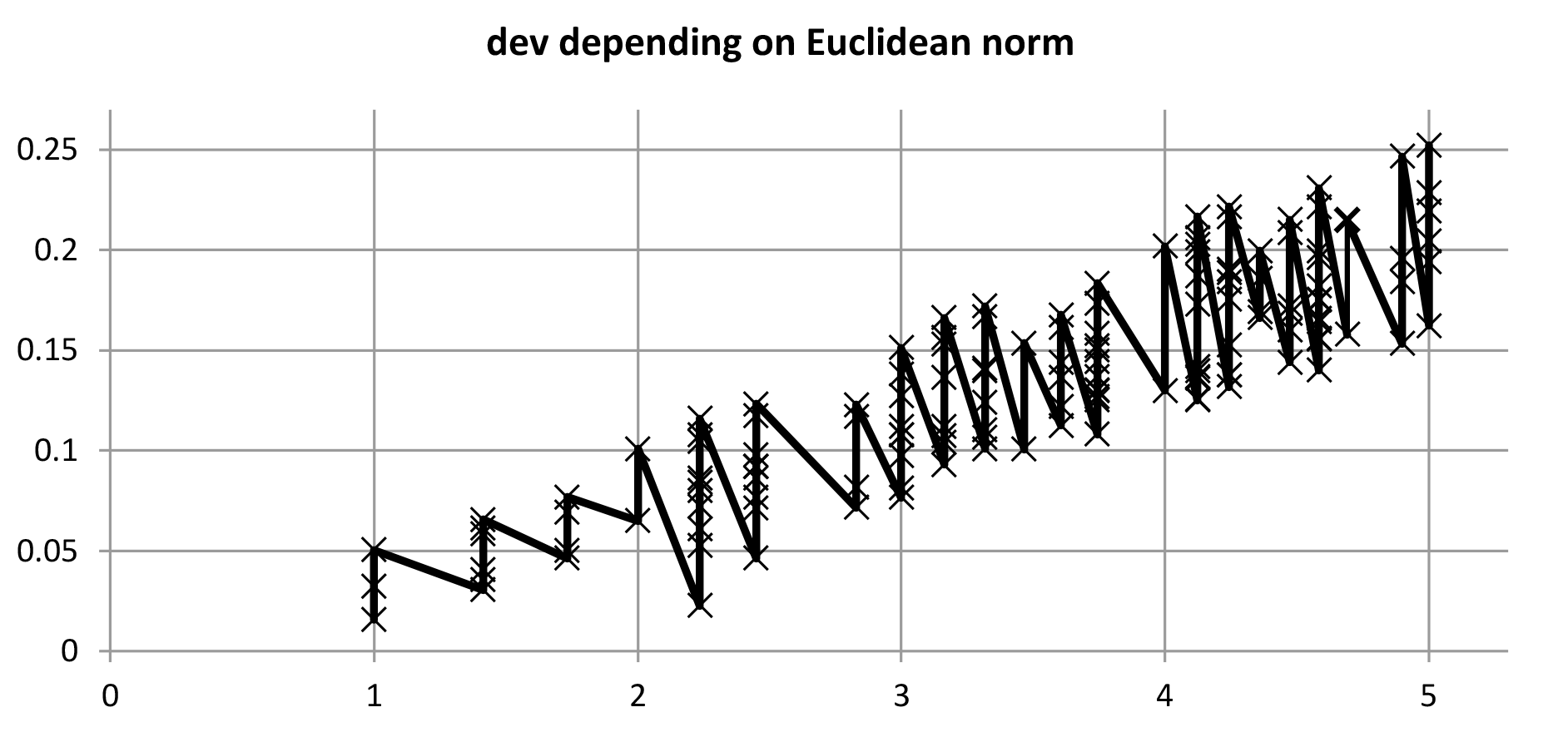 Figure 13a. The horizontal axis of this plot measures the distance of points (x, y, z) from the origin (0, 0, 0), and the vertical measures deviations in n-EDO fits. Points on the same vertical line are located on the same spheres about the origin. Neither the related coordinates nor the corresponding numbers n of the points between the spheres of radius 1 and 5 are indicated. The three points on the unit sphere represent the best EDOs with n = 53, n = 118 and n = 612.