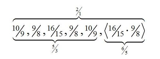 The combinations lead to just minor thirds (6 : 5) and two different whole tone steps (9 : 8 and 10 : 9).