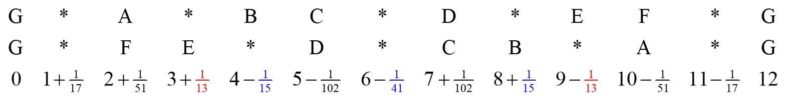 | 17-EDO | 0 | 2 | 3 | 5 | 5 | 7 | 8 | 10 | 12 | 12 | 14 | 15 | 17 |
