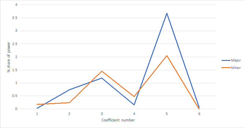 Krumhansl's observation can be demonstrated mathematically by applying the DFT to the tonal profiles. Figure 1 shows the spectra of the major and minor tonal profiles from Krumhansl and Kessler (1982), corresponding to the magnitudes of the six coefficients. In both cases, the most important coefficient is the fifth, the second most important is the third.
