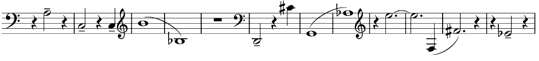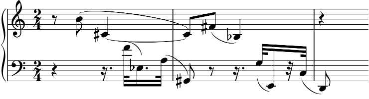 First, to check my assumption that the DFT spectrum provides an adequate substitute for von Hippel and Huron's procedure, I took the DFTs of the first and last dyads, trichords, tetrachords, and pentachords, and the initial hexachord of the row (by the complementation property, the two hexachords have the same spectrum), normalized these by power, 2 took the covariances with the power-normalized Krumhansl-Kessler major and minor spectra, chose the larger of the two for each set, and averaged these. The resulting ranking for the 86 rows was indeed very close to von Hippel and Huron's ranking, with a Spearman coefficient of .95. Of the set of top-15 rows mentioned by von Hippel and Huron, this procedure only misses the last two, which are the rows from Schoenberg's Op. 28/1 and Op. 29, the latter being a near miss (rank 16 instead of 15). The ambiguity of Op. 28/1, shown in Figure 2, is rather poetically appropriate, considering the text of the piece. This was ranked 22 by the DFT procedure, which instead preferred the "Akrobat" row from Berg's Lulu, shown in Figure 3 (rank 17 by von Hippel and Huron, and 10 by the DFT procedure). These discrepancies may be attributable to the discarding of phase information. The tonalness of Schoenberg's row is primarily attributable to the initial triad, which is able to neatly align in phase with multiple components. The tonalness of the Akrobat row is almost entirely in the dyads and (027) and (025) trichords. When these are phase-aligned with the f5 of a key, they are poorly aligned with the other important components, i.e., f2 and f3 or f4 and f3.