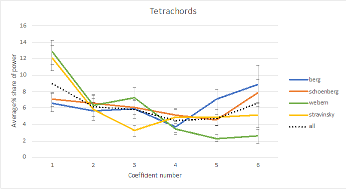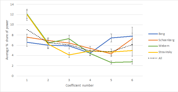 Having established this initial proof of concept, let us look more closely at the questions that the DFT enables us to answer: Which dimensions of tonality and atonality are most important for different composers' choices of rows? To amplify the musicological value of this analysis, I added some non-Viennese rows to von Hippel and Huron's data set, 18 rows used by Stravinsky in his late works. 3 On all of the tonality ranking procedures just described, Stravinsky's rows are generally quite low, similar to Webern's, with one exception, the row from Anthem ("A Dove Descends Breaking the Air") which is in the top ten on all measures.