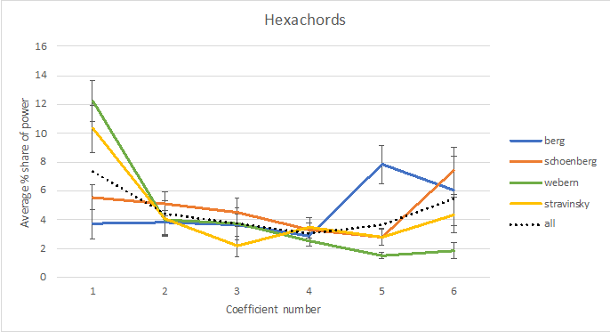 The f5 result is due to high diatonicity in Berg's rows and low diatonicity in Webern's. We do not see a similar difference in f3—in fact, if anything, Webern tends to have higher f3s than the other composers. The distinction in tonal fit between the Viennese composers is therefore attributable to diatonicity. The other significant result (on f1) is that Webern and Stravinsky use rows with higher chromatic clustering. In particular, we may note that these two composers differ from Schoenberg in their preferred atonal dimension. Schoenberg tends to achieve atonality with whole-tone sets (high |f6|), while Webern and Stravinsky do so with chromatic concentration. The results are consistent if we look at spectra for just the initial and final tetrachords or the hexachords averaged across composers, as Figure 6 shows.