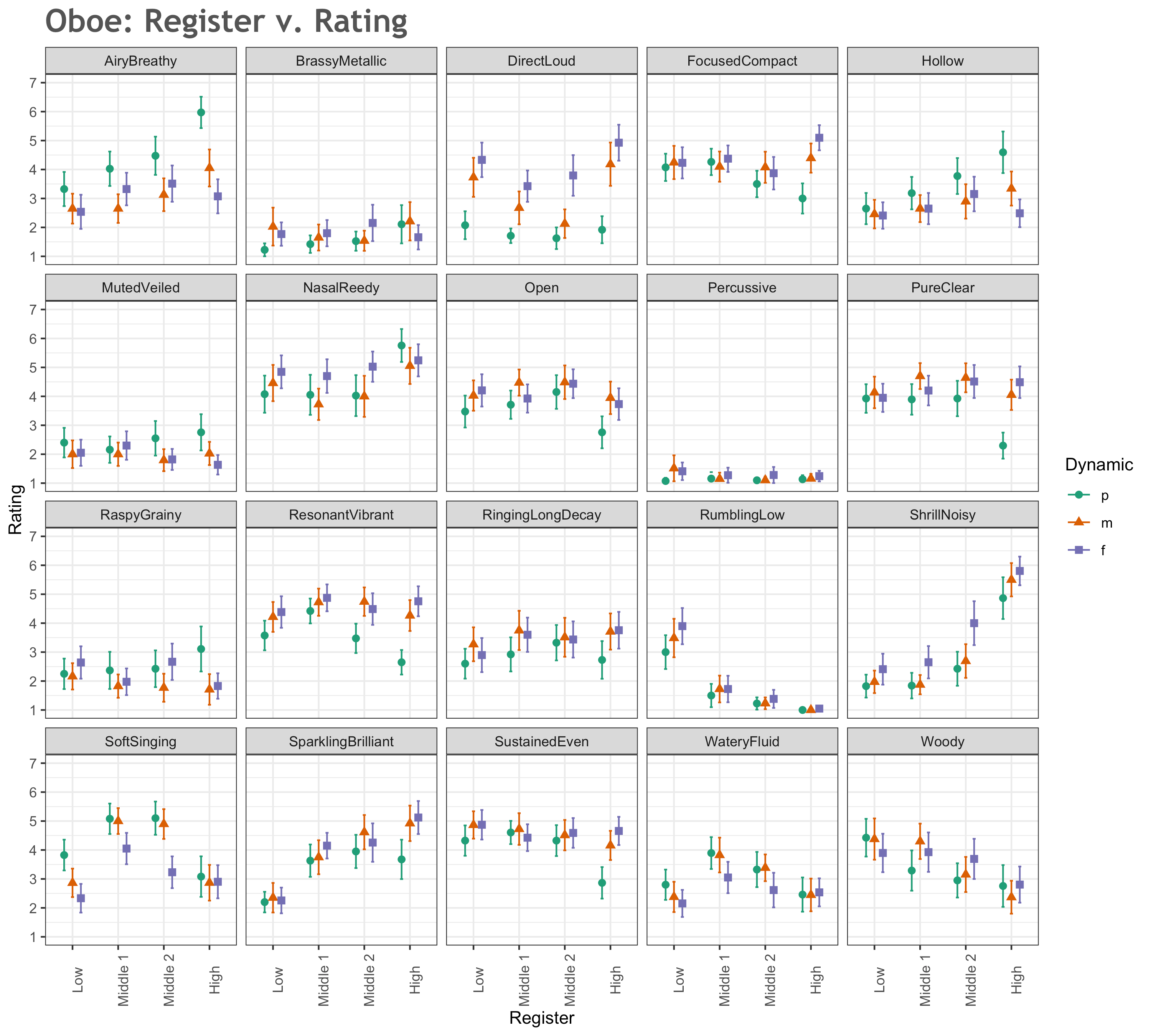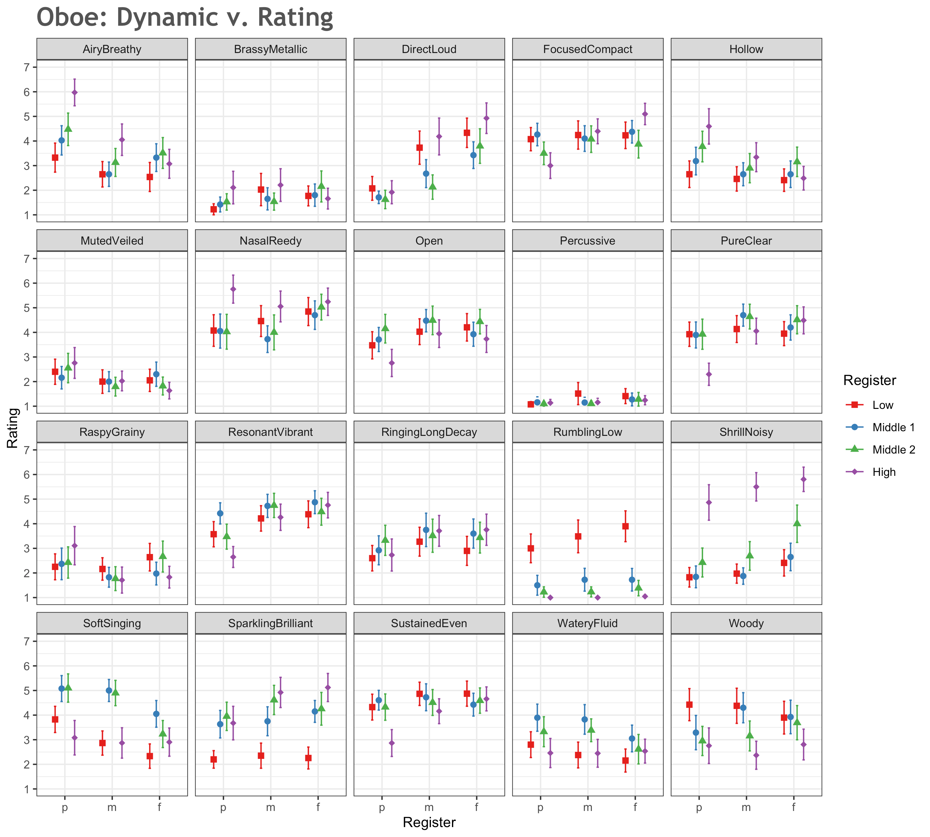 Means on each dimension as grouped by register and dynamics for the oboe are visualized in Figures 2 and 3. In these figures, the reported mean for each register is the average of the means of the three notes in each register set. Error bars illustrate the 95% confidence intervals. Figure 2 reports register on the x-axis, with shape/color of the points indicating dynamics. Figure 3 presents the same data, but with dynamics on the x-axis and register indicated by shape/color. Numerical data related to these figures can be found in Appendix D.