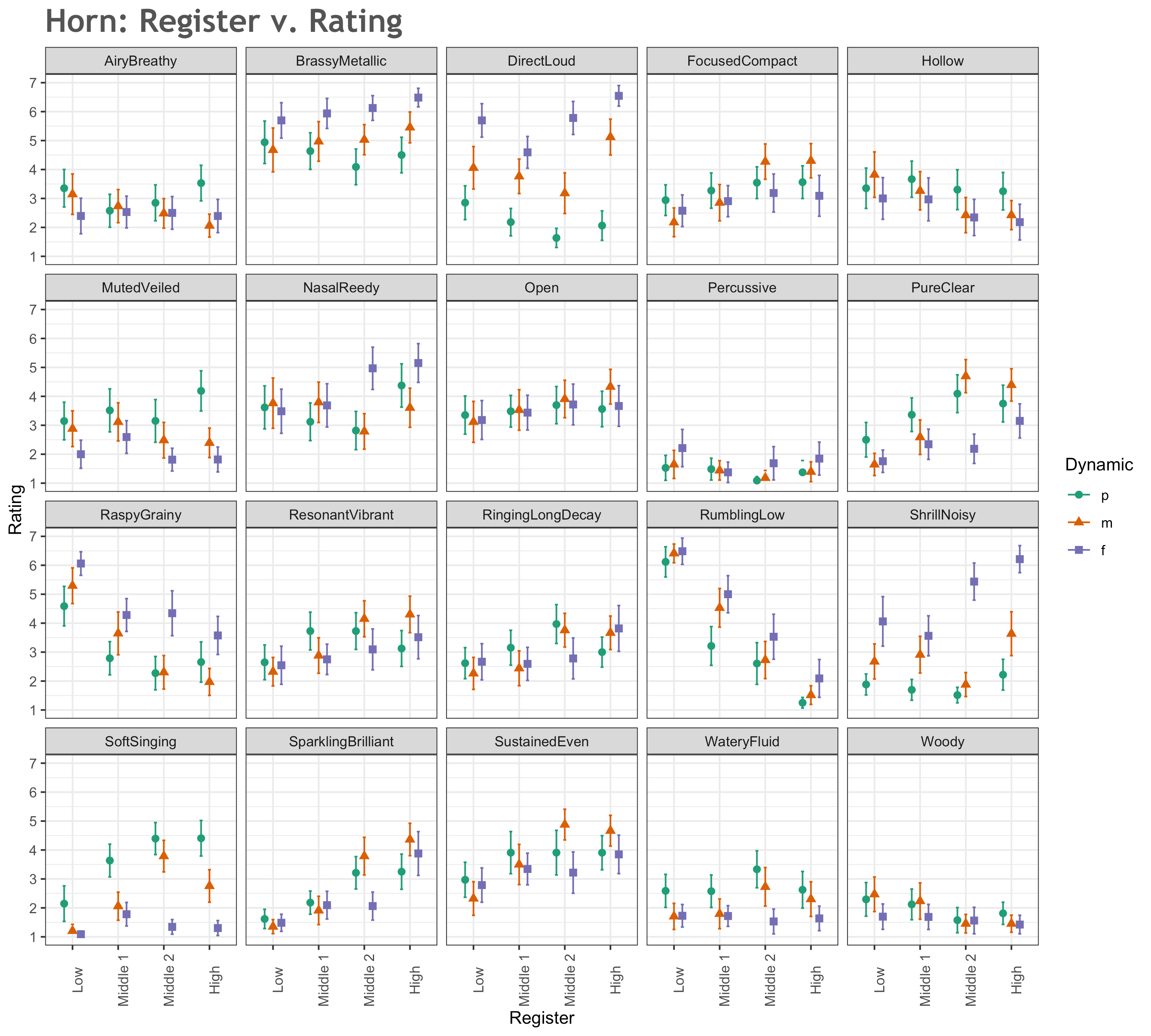 Examining the rating means across dimensions on a note-by-note basis—that is, for each pitch-dynamic combination—reveals some idiosyncratic notes. For example, at times, rating means on a given dimension vary more from pitch to pitch than between registers (see Discussion for more detail), suggesting that the practice of representing registers with multiple notes in order to help mitigate idiosyncrasies and better represent the register as a whole was useful. Individual note means are included in Appendix C.