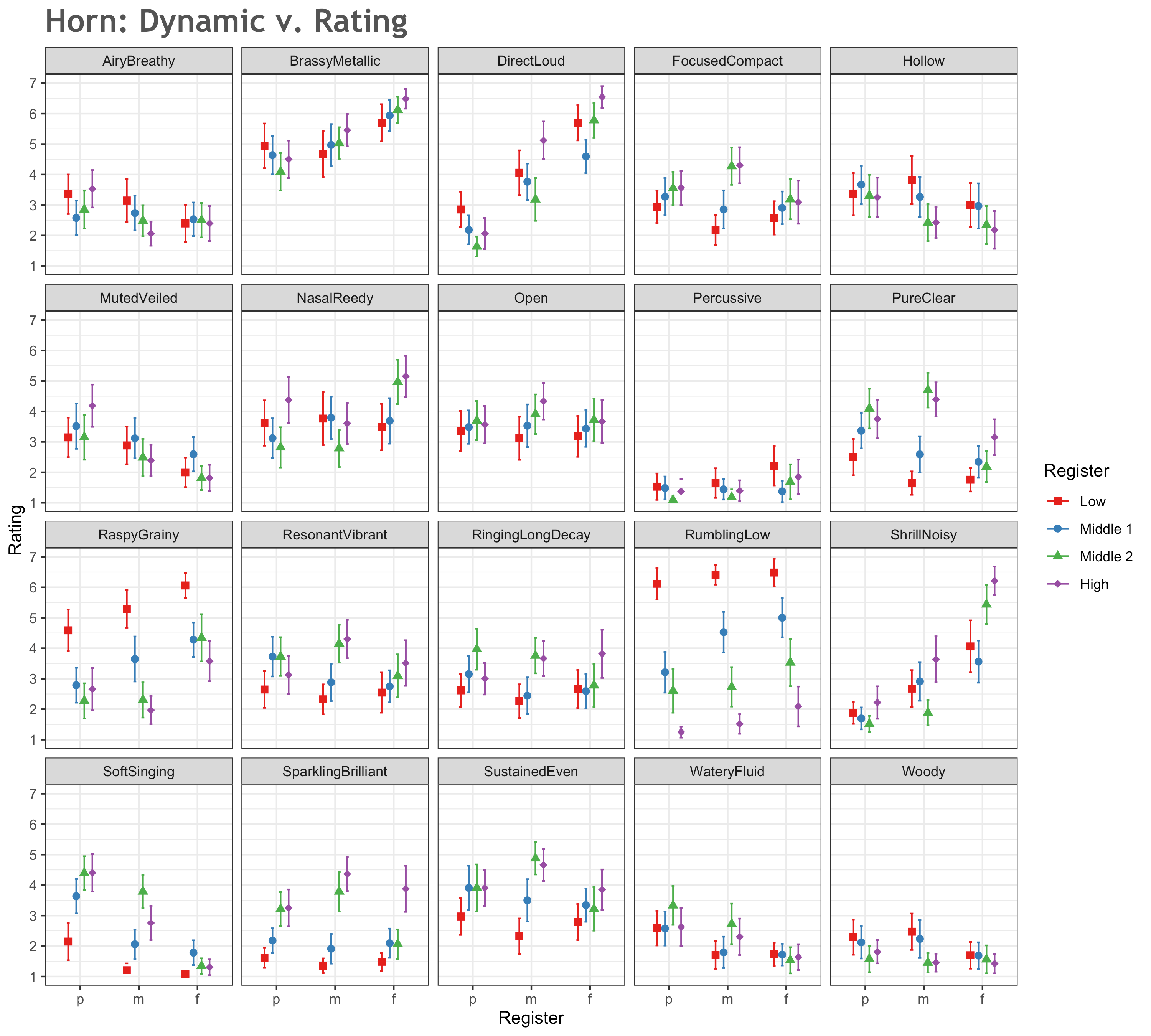 One likely reason that little research has been done on the semantics related to the timbral flexibility of individual instruments is that the possible combinations of pitch, loudness, articulation, duration, etc. are often multitudinous. Furthermore, due to differences in physical construction, it is probable that instrument sounds do not all vary uniformly, and there are likely interactions among factors affecting timbres—thus, a complete mapping of variations on one type of instrument will likely not be fully applicable to other instruments. The project of mapping out timbral interactions across many instruments is a formidable task and beyond the scope of any individual study. Though some trends may be generally or for the most part shared among certain groups of instruments—for example, a plausible tendency for brightness to increase systematically with pitch—the extent of such commonalities is unknown. Yet, the results of such endeavors to map conceptualizations of within-instrument timbral variations for a wide variety of instruments would be useful in both composition and music analysis. These findings could also be informative for future empirical research in timbre; for example, in providing a measure of semantic distances among stimuli. The primary goal of this exploratory paper is to determine which semantic dimensions may be most pertinent to register and to dynamics in order to make grounded future predictions.