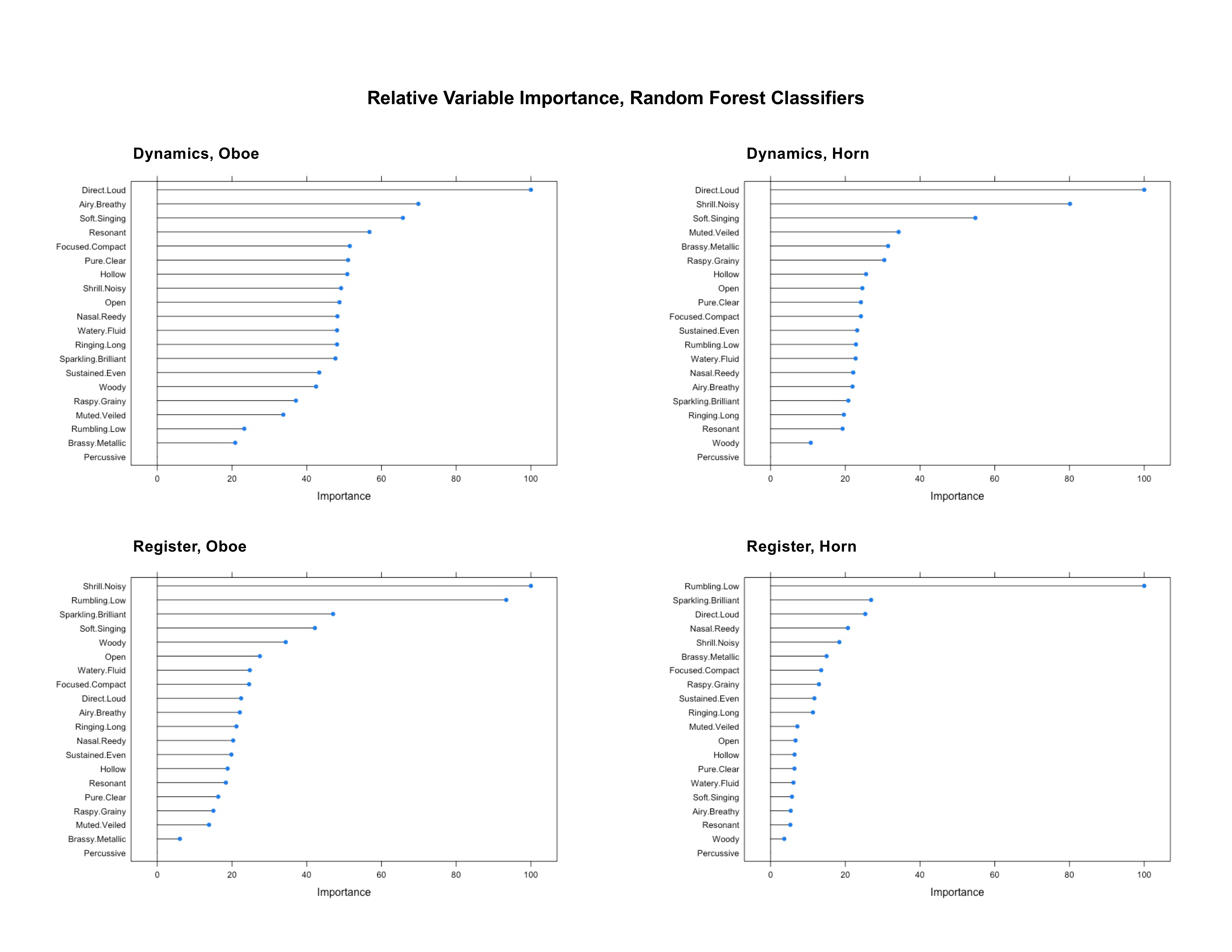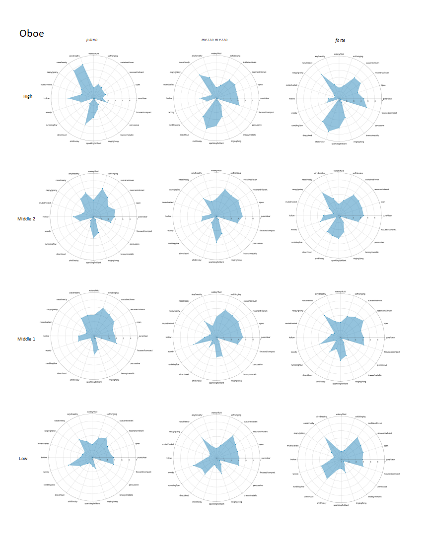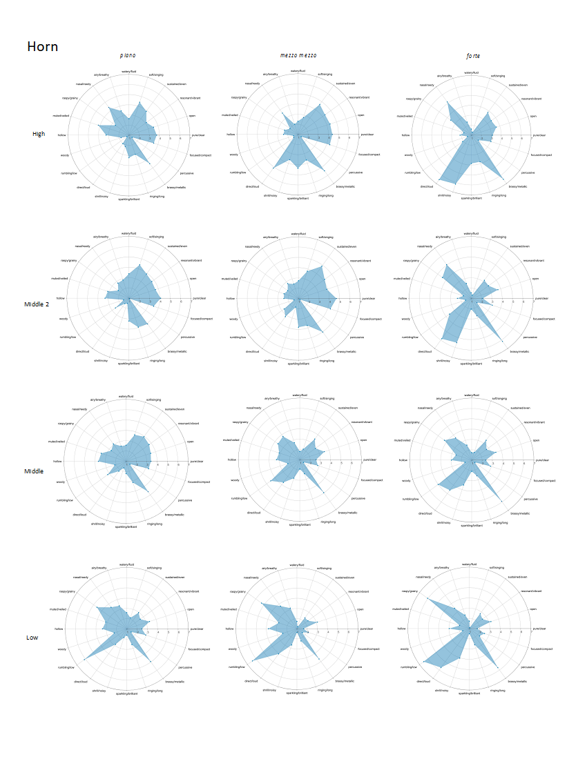 Thus, the in-depth, exploratory studies of two instruments presented here serve four principal purposes. The data are first intended to serve as a foundation for the development of hypotheses that can be tested in future experiments. Second, the study design is offered as a template for easily replicating the methodology with other instruments and/or augmenting it in order to investigate other timbral variations relative to parameters including but not limited to articulation, duration, specific instruments or brands, and acoustic environments. This design could be used both in additional in-depth, exploratory studies, such as this one, or in wider studies intended to test hypotheses and/or models. Third, this study serves as an evaluation of Reymore and Huron's timbre qualia model: although Reymore (2021) offered evidence of the model's reliability across studies, both studies used imagined instrument sounds. Questions remain about whether ratings of recorded timbres are comparable to ratings of imagined timbres. The results of this study provide insight into these questions. Fourth, the detailed data reported in this paper for oboe and horn can be used for timbrally focused music theoretical analyses of solo pieces and may be informative for composition.
