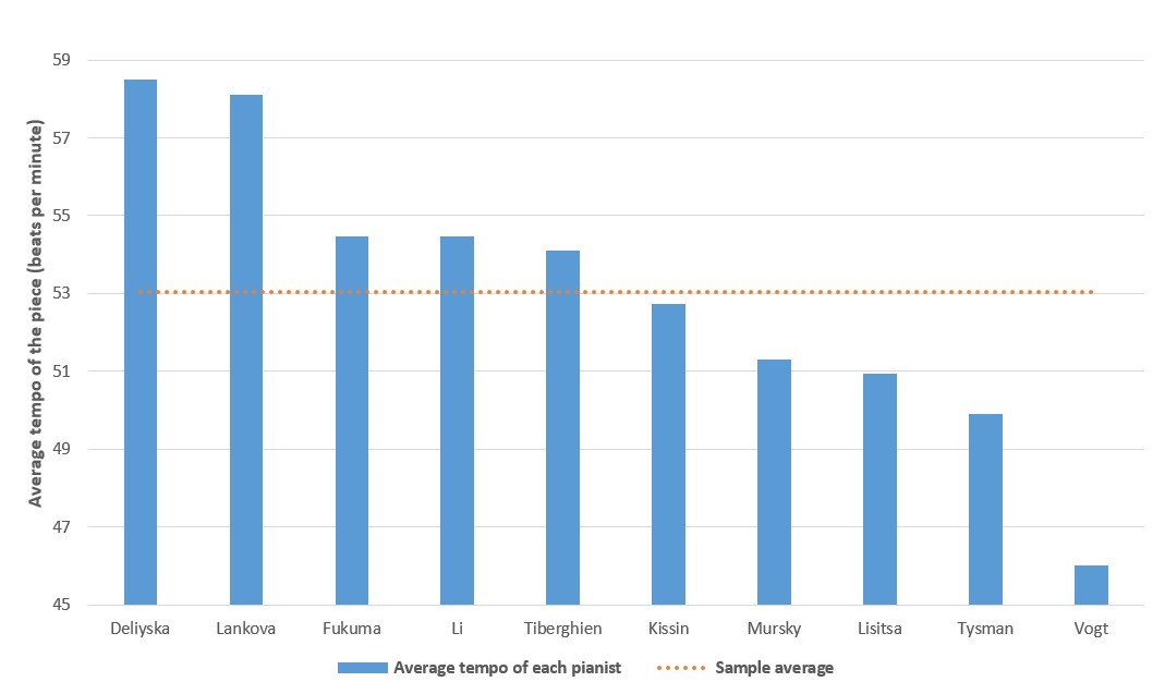| Pianist | Number of fast sections (max. 5) faster than the average | Number of slow sections (max. 5) slower than the average | Total number of sections (max. 10) faster / slower than the average |