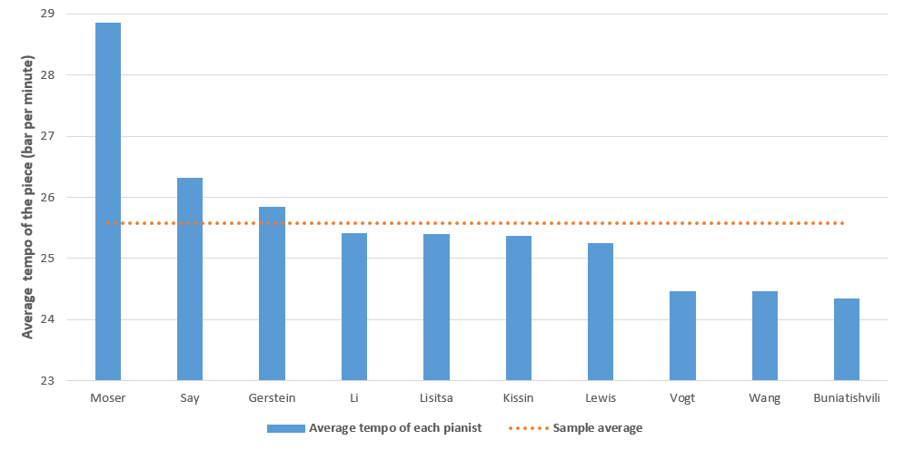 Figures 1 and 2 show the average basic tempo (item 1) of each of the ten performances of the two pieces (indicated by the bars) as well as the average value of the sample (item 3, indicated by the horizontal dotted line). It can be seen from the two figures that the average basic tempo of both Lisitsa and Kissin in both Chopin's Ballade and Liszt's Sonata are a little slower than the average tempos of the samples of the respective piece. For Chopin's Ballade, Lisitsa and Kissin are the eighth fastest (i.e., the third slowest) and the sixth fastest (i.e., the fifth slowest) respectively among the ten pianists. For Liszt's Sonata, Lisitsa and Kissin are the fifth and the sixth fastest respectively. In these results, the main point is not the degree of difference but the fact that neither Lisitsa nor Kissin's average overall basic tempo of the two selected pieces are faster than that of their contemporaries.