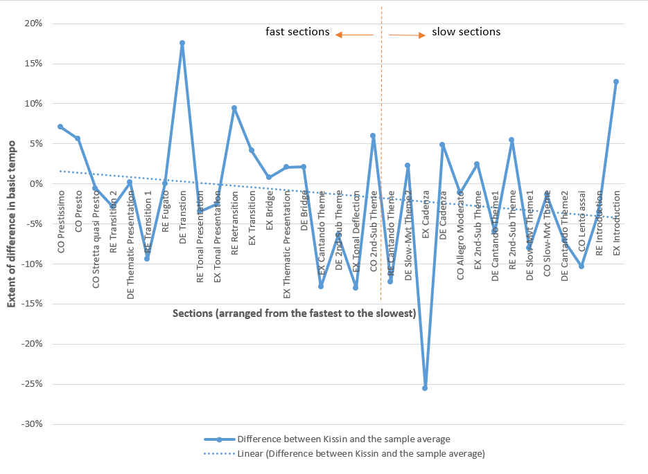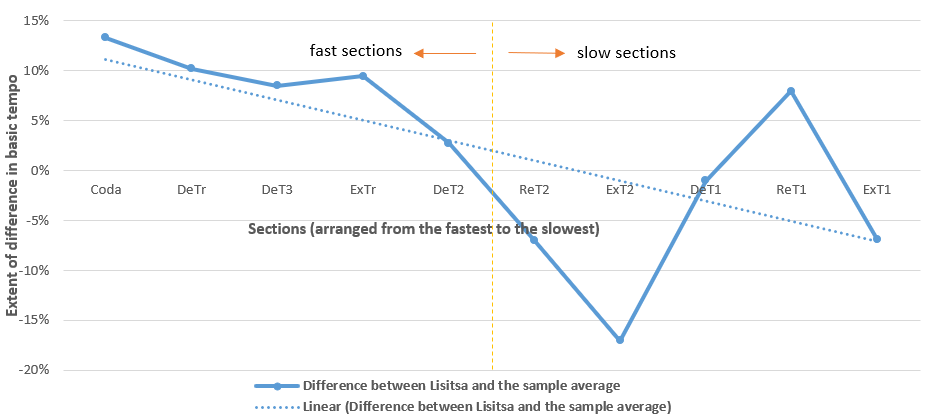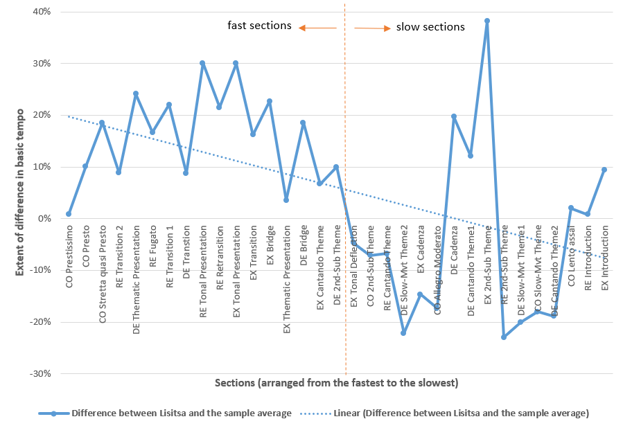 - The extent to which a performer tends to play fast sections with exceptionally fast tempo and slow sections with exceptionally slow tempo. It was suggested in previous studies that virtuosos play fast music exceptionally fast to showcase their technical accomplishment. It is therefore necessary to examine whether the two alleged virtuosos always play fast sections of the two pieces in exceptionally fast tempo (i.e., consistently faster than the average tempo of the sample) and whether the faster the sections the faster they play. To achieve this goal, all the sections of each selected piece were arranged in the order of basic tempo: from the fastest section to the slowest section, according to the average tempo of the sample in each section (item 4). In this analysis, we have split each work into faster and slower sections based on the average tempo in each section, allocating half of the total number of sections to 'fast' and the other half to 'slow' sections. Accordingly, Chopin's Ballade is divided into five fast sections and five slow sections. Liszt's Sonata is divided into 17 fast sections and 16 slow sections. Having established the extent to which a particular performer plays each of these sections faster or slower than the average basic tempo of the sample (item 5) and having arranged the sections of each piece in a descending order of average basic tempo, a graph easily shows whether and to what extent a performer tends to play the fast sections faster than the average tempo of the sample, with the sections (arranged from the fastest to the slowest) on the x-axis and the extent to which the performer plays each section faster or slower than the average tempo of the sample on the y-axis. The slope of the linear regression line in the graph (i.e. the linear regression of all results of item 5) reveals this tendency of a performer. We term this tendency the 'extreme tempo tendency' as it indicates a performer's tendency to of faster the section faster he/she plays. It is calculated using the 'SLOPE' function in Excel, covering the differences in basic tempo between the performer and the average of the sample of all sections of a piece, arranged from the fastest to the slowest: 'SLOPE(Ta:Tx,Ea:Ex)', where Ta refers to the average basic tempo of the sample of the fastest section of the piece, Tx refers to the average basic tempo of the sample of the slowest section of the piece, Ea refers to the extent to which a particular performer plays the fastest section (Ta) faster or slower than the average basic tempo of the sample, and Ex refers to the extent to which a particular performer plays the slowest section (Tx) faster or slower than the average basic tempo of the sample. A positive number indicates that a performer demonstrates extreme tempo tendency – playing fast sections generally faster than the average of the sample and slow ones generally slower. A negative number indicates that a performer plays fast sections slower and slower sections faster. The larger (more positive) the number the stronger the extreme tempo tendency; the smaller (more negative) the number the weaker the extreme tempo tendency. The unit of the slope is the percentage difference in tempo (between the performer's sectional tempo and the average of the sample) per bpm (beat per minute or bar per minute).