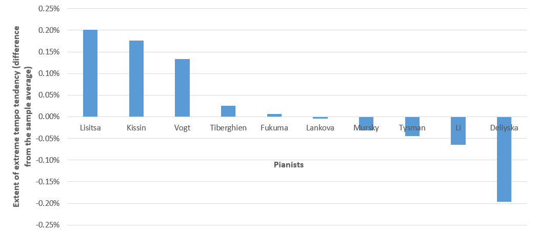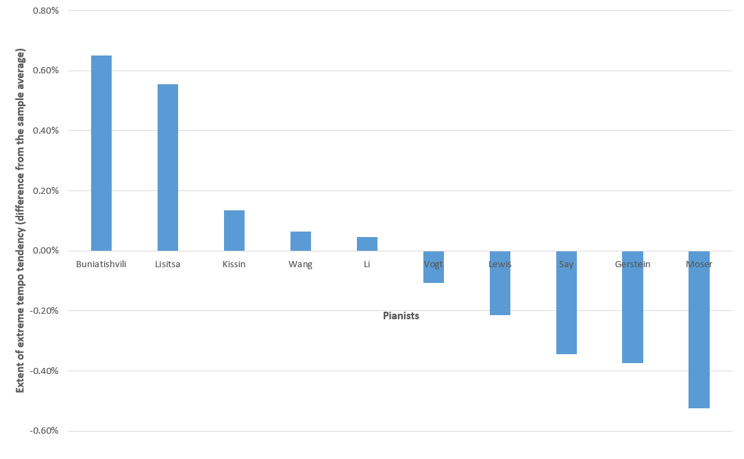 The results indicate that Evgeny Kissin and Valentina Lisitsa have been most often hailed as virtuosos by music critics of English-speaking countries. This, however, does not suggest that the remaining pianists in the sample, all renowned in their own rights and affiliated with international labels, do not display characteristics of virtuosity in their playing at all. Instead, the reviews simply less often label them as virtuosos than they do with Kissin and Lisitsa. These seemingly 'lesser virtuoso' pianists are therefore a real sample that comprises modern pianists of diverse cultural and educational backgrounds as well as stylistic tendencies. It is against this real sample that the two alleged virtuosos – Kissin and Lisitsa – are empirically studied to test whether and in what ways their tendencies in basic tempo differ from their contemporaries.