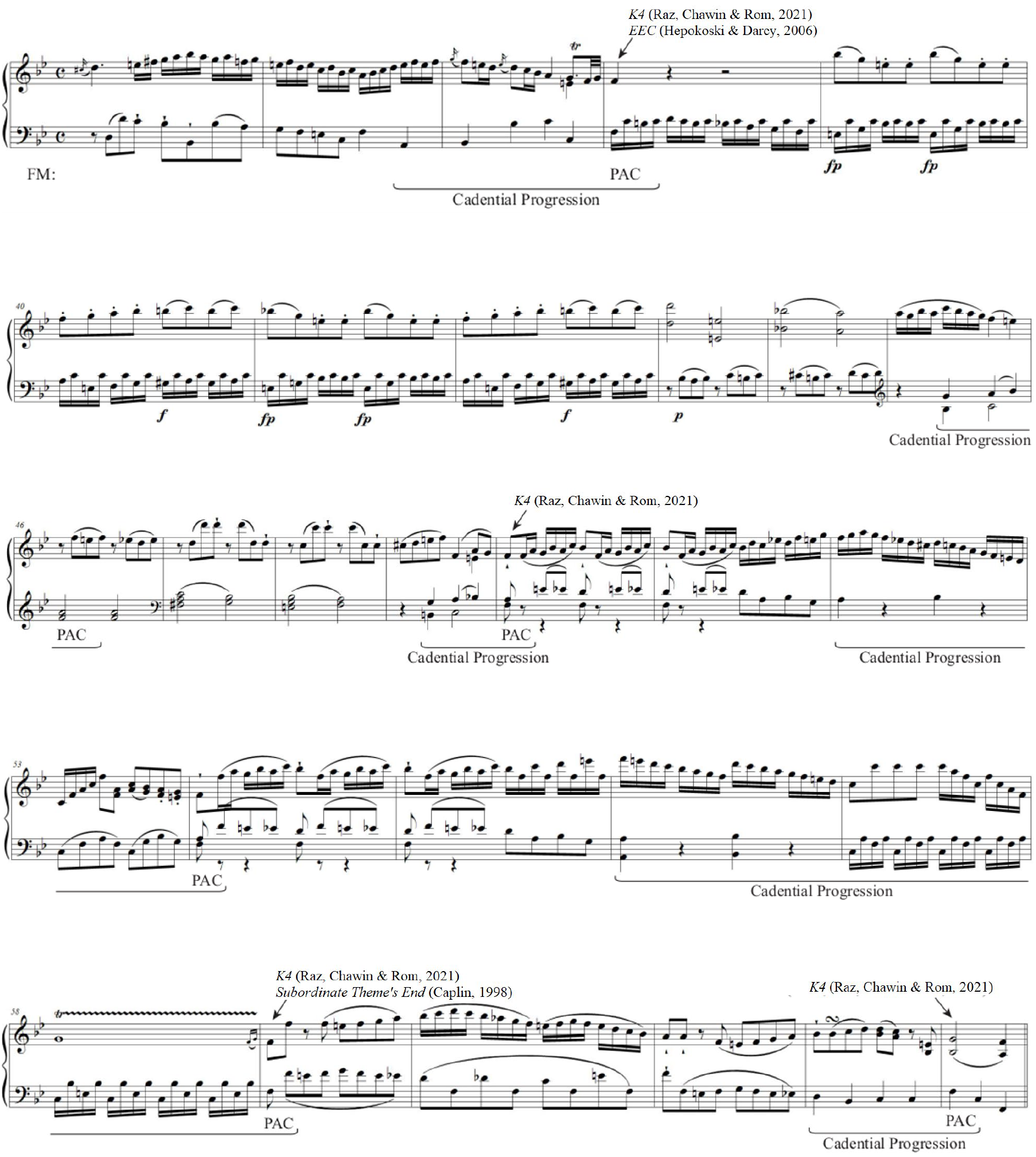 Fig 1. Mozart, Piano Sonata in B, K. 333, Mvt. I, mm. 36-63. Annotations show all perfect authentic cadences following the subordinate theme's onset, the progressions that effect these cadences, the four Kochian K4 cadences identified by Raz et al. (2021), the point of essential expositional closure that Hepokoski & Darcy (2006) would likely identify, and the ending of the second theme as Caplin (1998) would likely analyze it.