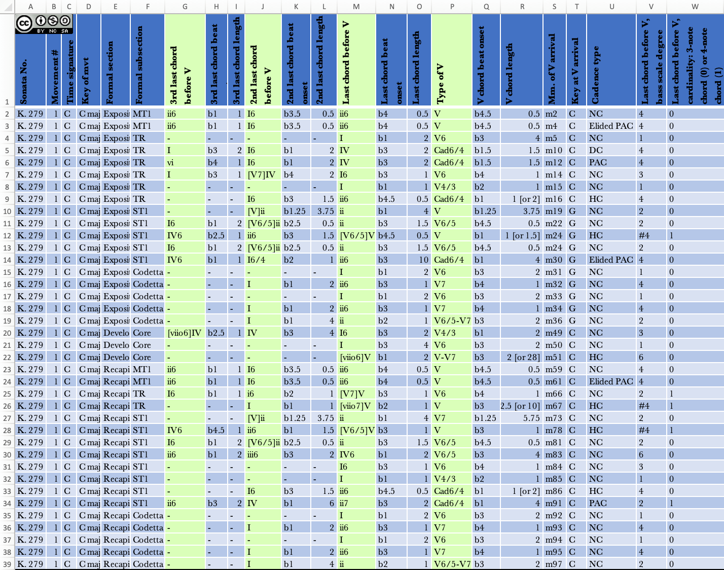 The following dataset can be found here: https://osf.io/7pa6m/?view_only=36d6fd8c9fda4a1398e68445b509959e. Figure 1 illustrates a portion of the dataset; this excerpt includes all rows (and thus all V chords) for K. 279, first movement.