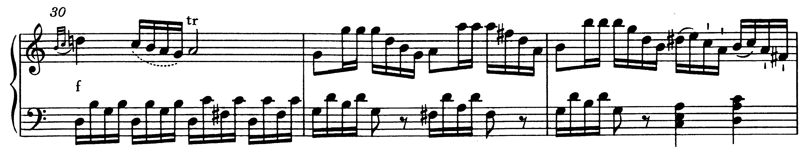 Working backward from the dominant harmony, columns M, J, and G list the three harmonies prior to the dominant. As mentioned above, dashes appear if a harmony belongs to a previous phrase or is another V chord. An example from K. 279/1, shown in Figure 2, illustrates the second case. Measure 30 contains a cadential 6/4 and its resolution, leading to an elided perfect authentic cadence, events which are captured in the dataset in row 14 (see Figure 1). In m. 31, another dominant harmony occurs after the cadence; this V6 is included in row 15 of the dataset, as is the root-position tonic chord that precedes it. The second-last chord before the V6, however, is the cadential 6/4 and its resolution, which is already accounted for in row 14. Thus, there are no harmonies entered in columns J and G in row 15.