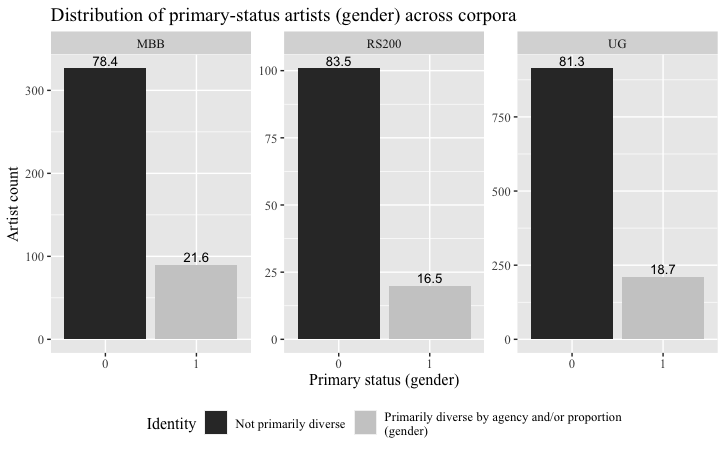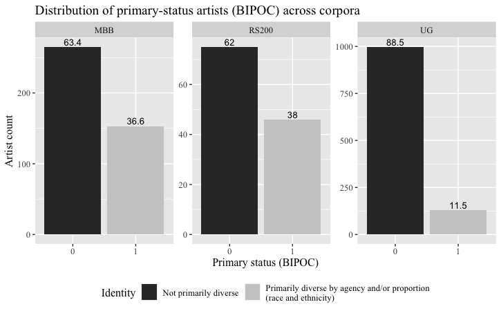 Figures 1 and 2 respectively model the distribution of artist identity under the gender and BIPOC parameters in each individual corpus sample. Table 2 provides summary statistics for each parameter across the combined corpora. As shown, all three samples largely prioritize white and male artists, even under the less restrictive conditions of non-male, non-cis, race, and ethnicity. The Appendix includes additional summary figures, including by song count for the RS200 and MBB corpora.