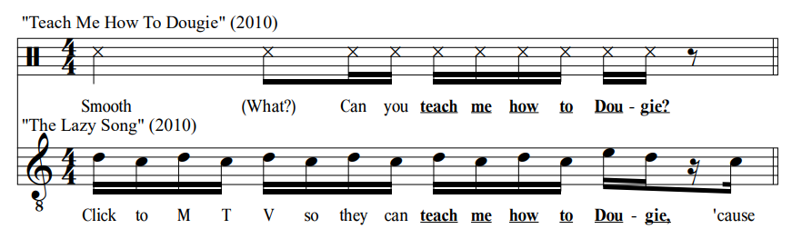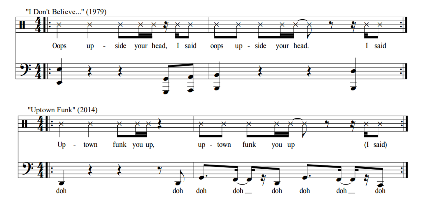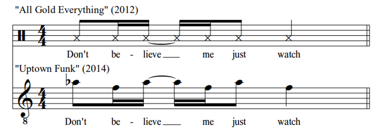 Many of the user-identified "interpolations" in the music of Bruno Mars (Table 3) also present relatively clear cases of musical borrowing. Three of the most straightforward examples on the above list are quotations of rapped or spoken vocals. Although there is no clear melody in any of these excerpts, Mars preserves the rhythm and metrical placement of the words of each of the borrowed passages. In "The Lazy Song," Mars glosses the title line of Cali Swag District's "Teach Me How to Dougie;" see in Figure 1 that these six syllables are spoken or sung (respectively) on "3-e-&-a-4-e" of the bar in both songs. Similarly, in "Uptown Funk," the line "Don't believe me just watch" clearly references Trinidad Jame$ song "All Gold Everything;" these words are intoned with the same "1 & a (2) e & 3" rhythm (See Figure 2) in each context, and this line is repeated at least five times in a row in both songs, forming the basis of an entire section or stanza. 6 The spoken-word bridge of "Uptown Funk" is likewise derived from an earlier source. See in Figure 3 that the opening of the Gap Band's "I Don't Believe You Want to Get Up and Dance (Oops)" must surely form the basis of this section. Not only are the rhythms of the spoken word vocals identical (give or take an interjection of "I said") but the bass line that accompanies each is also similar; both feature a minor pentatonic scale with a shared subtonic anacrusis leading to a strong tonic downbeat.