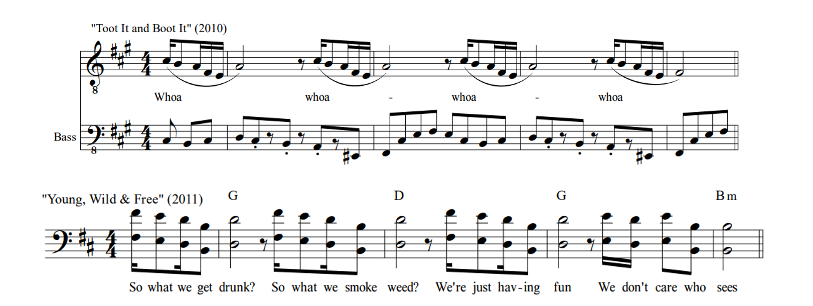 The assertion that "Young, Wild & Free" reworks "multiple elements" from YG feat. Ty$, "Toot It and Boot It," is likewise mostly correct, but only the vocal melody of the song is adapted. See in Figure 4 that the melody is borrowed directly, though in a different key and with new text added. This was presumably identified as an interpolation of multiple instruments because this melody forms the basis not only for the vocals of "Young, Wild & Free," but also for some of the newly composed piano parts that echo the vocal line; put another way, multiple elements of a new song are created from what was a single element in the source. Outside of the shared vocal melody, the instrumental context of each is otherwise strikingly different. As seen on the chart of direct samples above, the drum beat in "Young, Wild & Free" is borrowed from another source entirely, and the minor-mode bass line that accompanies the untexted vocal melody in "Toot it and Boot It" is abandoned and replaced by bright piano chords that recontextualize the melody in the major mode.
