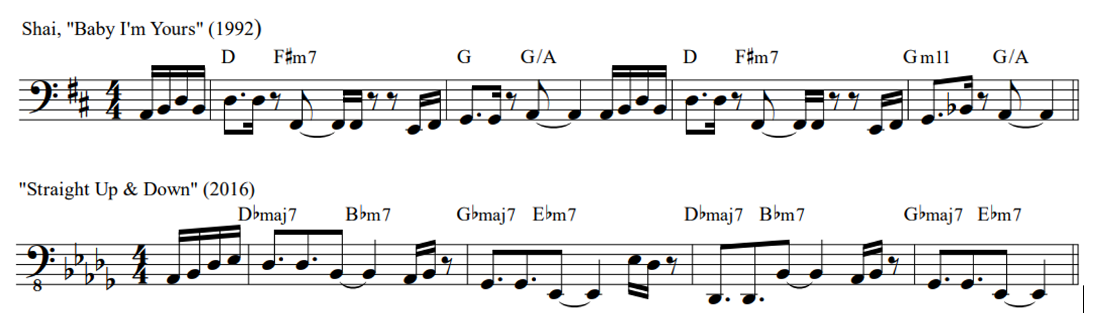 The two remaining "interpolations" listed in Table 3 above require further exploration. Curiously, both examples reportedly adapt material from different songs named "Baby I'm Yours." Compare the opening bass lines and harmonies of Shai's "Baby I'm Yours" (1992) with Bruno Mars' "Straight Up & Down" (2016) in Figure 5, and—more crucially—listen to the two, as the shared "feel" from a similar tempo with swung 16th notes is not easily captured with graphic notation. The respective bass riffs emphasize similar rhythmic patterns, the chords appearing on the downbeats match, and the harmonic rhythm is the same. Further, the soft, mellow keyboard sound in "Straight Up & Down" should immediately remind the listener of an early 1990s R&B ballad. Beyond the respective opening progressions, the songs have identical formal plans. Though the order of sections is fairly paint by number in each (two verse-chorus cycles followed by a bridge and final repeating chorus), there are nevertheless some meaningful commonalities; namely, both songs return to their respective "stable" verse chord progressions in the chorus after a brief, more chromatic departure from it in the transition from the former to the latter.