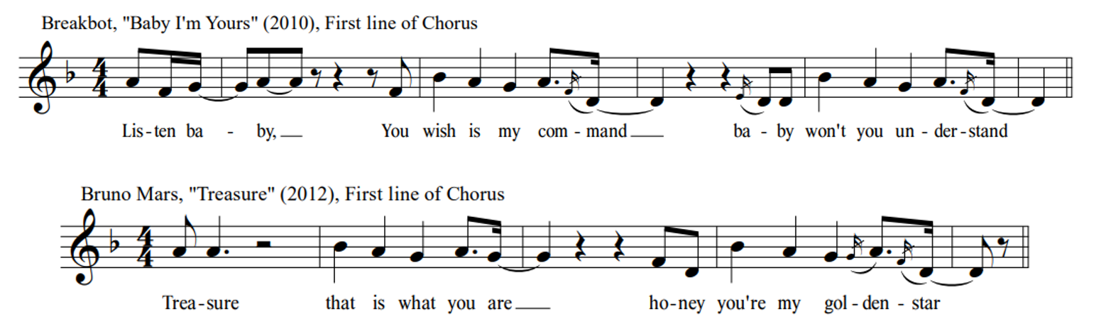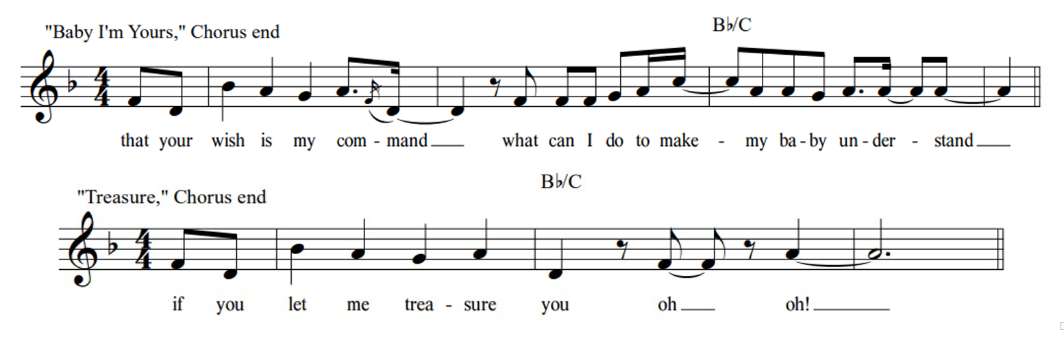 The reported sample of the Breakbot (featuring Irfane) song "Baby I'm Yours" in "Treasure," however, is somewhat more convincing. Compare the respective opening and closing lines of the chorus of each song in Figures 6a and 6b. For ease of comparison, the two songs are notated in the same key; even though "Treasure" is a step lower than notated here, there are enough shared elements to posit—though not "prove"—that Bruno Mars and his team used this song as a model in composing "Treasure." Not only is there a great deal of melodic similarity, but the chorus of each ends with the very same V13-type harmony: the notes of a subdominant chord with ^5 in the bass and ^3 in the melodic voice. Further, two the songs are in precisely the same style (Neo- or Nü-Disco), making it seem likely that one did indeed inspire the other.