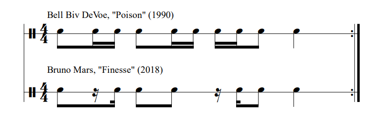 Given the regularity with which Bruno Mars alludes to older styles, one might expect to see more reported examples of interpolation on whosampled.com. There are two potential entries that are—at least to me—surprisingly absent from the site: "Locked Out of Heaven" (2012) and "Finesse" (2016). When I first heard the opening passage of each of these songs, I was momentarily "fooled" into thinking they were recorded in an earlier decade. 9 Noticing the distinctive stylistic blend of reggae and rock in the introduction of "Locked Out of Heaven", I assumed that I was listening to a song by The Police with which I was previously unaware. 10 Only upon hearing Bruno Mars's voice (rather than Sting's) did I realize that the song was a product of 1980s nostalgia rather than an artifact of that decade. In "Finesse", the aforementioned "orchestra hit" sound is only the tip of the iceberg when it comes to capturing the sound of this period. It is a clear pastiche of the "New Jack Swing" style. I was initially convinced that it was an early 1990s hip hop/R&B song, in part because the song begins with a clear allusion to what is perhaps the best remembered song in this style: Bell Biv DeVoe's "Poison" (1990). Both songs begin with several repetitions of a drum pattern on a snare-type sound. See in Figure 7 that this is not a verbatim quotation (nor literal sample), but when one hears the opening drum riff of "Finesse," it's difficult not to think of "Poison."