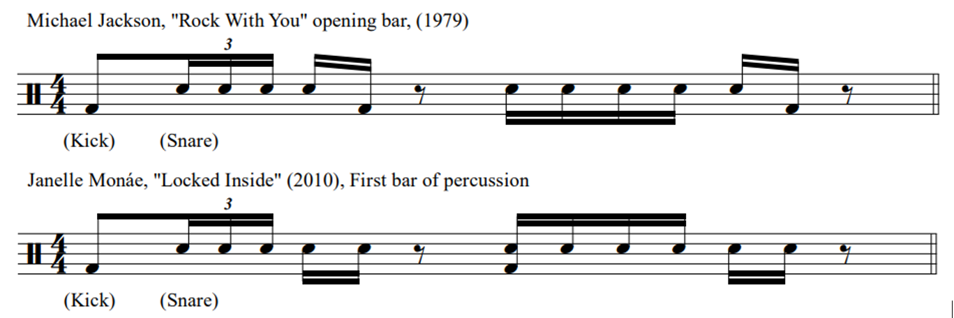 As was the case with the music of Bruno Mars, the direct samples reported in Monáe's music (Table 4) appear to be largely correct and clear. The only one that demands commentary is the reported sample of the opening drum riff of Michael Jackson's "Rock With You" in Monáe's "Locked Inside." Both passages feature a measure of percussion with precisely the same rhythm (One tri-po-let Two e, Three e and a Four e), yet this passage is not a literal sample; see in Figure 8 that different parts of the drum set are used. Although this is not a "true" digital sample, the reader may decide whether the motive in Monáe's song is a reference to Michael Jackson's iconic song, or if the resemblance between the two passages is simply a coincidence. 11