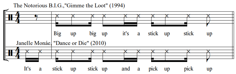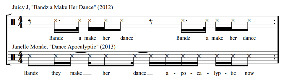 Of the ten interpolations reported in Monáe's music (Table 5), however, only a small minority present clear cases of musical borrowings. The reported quotations of rapped lines in "Dance or Die" and "Dance Apocalyptic" are the least controversial of the bunch. See in Figure 9 that although Monáe raps slightly different words than those appearing in Biggie's hit, the identical rhythm and comparable repetitions of two-word phrases in her/their "Dance or Die" make it clear that she/they is "riffing"—or perhaps signifyin(g)—on "Gimme the Loot." 12 Likewise, Juicy J's "Bandz a Make Her Dance" seems to be the source of the repeated opening line(s) of her/their "Dance Apocalyptic" (Figure 10). Though the rhythm is not precisely the same, someone on Monáe's creative team must have been aware of this song; like Bruno Mars' quotation of "Teach Me How to Dougie" in "The Lazy Song," Monáe tips her/their hat to a song that was on the charts while "Dance Apocalyptic" was in production.