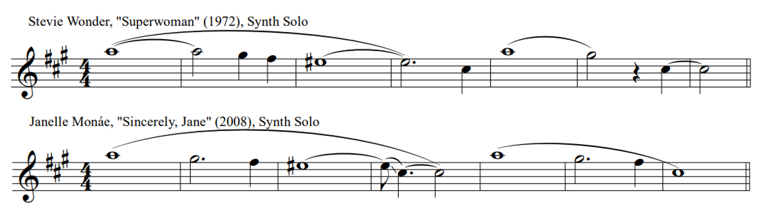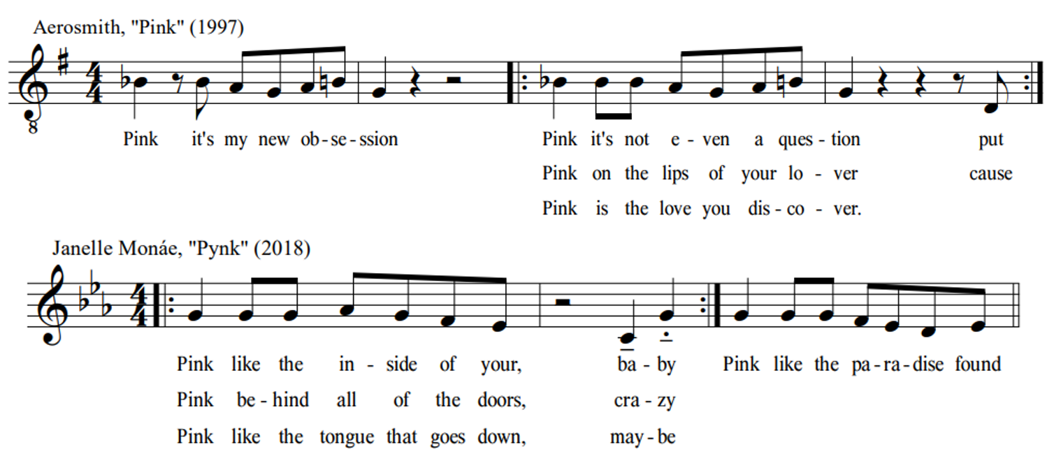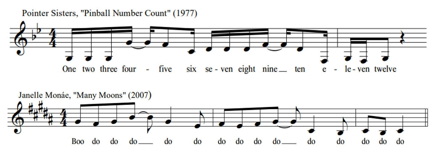 At least four of the other reported interpolations are likely "correct" identifications of borrowing, or at least allusion. In Monáe's "Sincerely, Jane"—which (see Table 4 above) includes one clear direct sample from a soul record already—the spoken words "live your life" may indeed reference Marvin Gaye's "Save The Children," and the synth line is likely an homage to Stevie Wonder's "Superwoman" (see Figure 11). Yet the material reportedly borrowed in both cases, though plenty similar, is not distinctive enough to argue unequivocally that one is the source of the other. The same can be said of the passages of Monáe's "Many Moons" that sound like the Pointer Sisters' "Pinball Number Count" (Figure 12); the resemblance is striking—a fifteen-note minor-pentatonic segment with identical rhythm and similar contour—yet one might hesitate to posit (without qualification) that Monáe paraphrases a tune from such an early vintage of Sesame Street. Lastly, though it is uncertain if Monáe (consciously) had Aerosmith's "Pink" in mind when she/they drafted "Pynk," the two songs certainly have a lot in common. See in Figure 13 that the first verse of each comprises four two-bar phrases; each begins on the word "Pink" and features a descending mediant to tonic melodic figure. 13