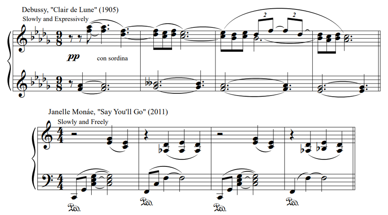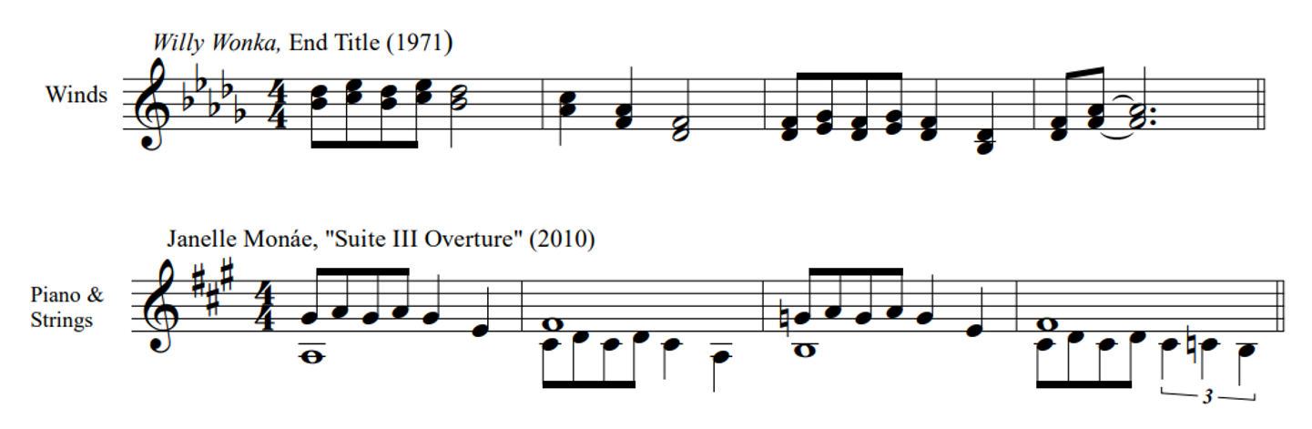 The remaining examples demand further scrutiny. First, although it is clear that "Wondaland" includes allusions to Christian worship music, it is misleading—and probably incorrect—to cite a single hymn as the source of the word "Hallelujah." Similarly perplexing are the other two reported samples from sources beyond the popular music canon. The "Suite III Overture" is at least superficially similar to the Willy Wonka end title music (Figure 14), but to suggest that the former borrows from the latter seems a bit of a stretch. Likewise, the reported interpolation of Debussy's "Claire de Lune" in Monáe's "Say You'll Go" is partially correct. If one were to listen only to the segments at the time stamps provided (Figure 15), though reasonable to infer that one inspired the other, it's a bridge too far to call one a quotation—much less a sample—of the other. Later in "Say You'll Go," however, there is an extended, "verbatim" quotation of "Claire de Lune." Though transposed a half-step higher, and other layers are added atop it, the borrowed material from Debussy is otherwise unchanged. One wonders why the user who created this entry did not supply these time stamps instead of, or in addition, to the one notated in Figure 15.