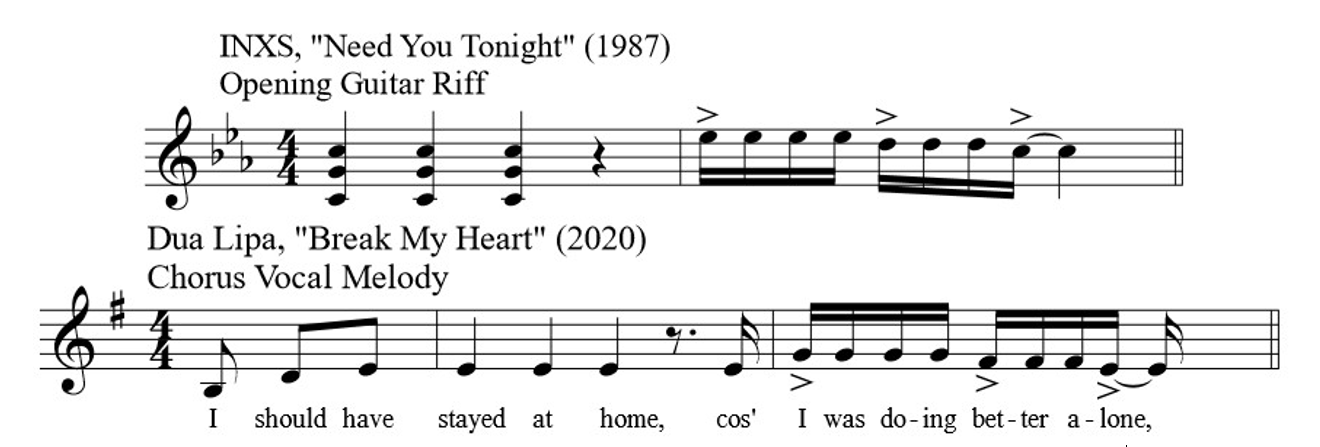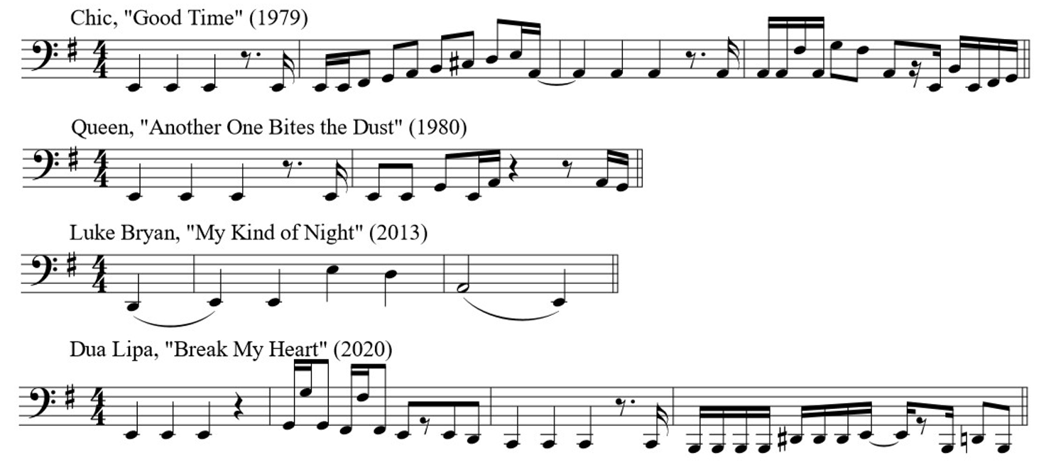 Neither the third nor the fourth entry, however, is a clear example of a quotation or paraphrase from a single source. Each reveals a somewhat more complex story. The suggestion that Lipa's "Break My Heart" borrows from INXS's "Need You Tonight" is not without merit. Compare the vocal melody of the chorus of "Break My Heart" to the opening guitar riff of its reported source in Figure 16. Both melodies, if only for a moment, are quite similar, featuring a two-bar segment with identical rhythm and a melody constructed with the first three degrees of a minor scale. Despite the clear melodic similarity, the songs have little else in common. It seems unlikely, therefore, that one borrows directly from the other. Instead, this is a case of two songs drawing from the same stylistic well rather than outright quotation or sampling. If a single source for both songs can be identified, it is most likely the opening bass riff from Chic's "Good Time," which has provided inspiration for countless artists looking to harness the dance-floor fun of a "funky" disco track. Compare in Figure 17 the basslines in songs by a rock band (Queen), a country artist (Luke Bryan), and a pop star (Dua Lipa) that all begin with remarkably similar repeated ostinati, each of which include multiple quarter note hits on low E.