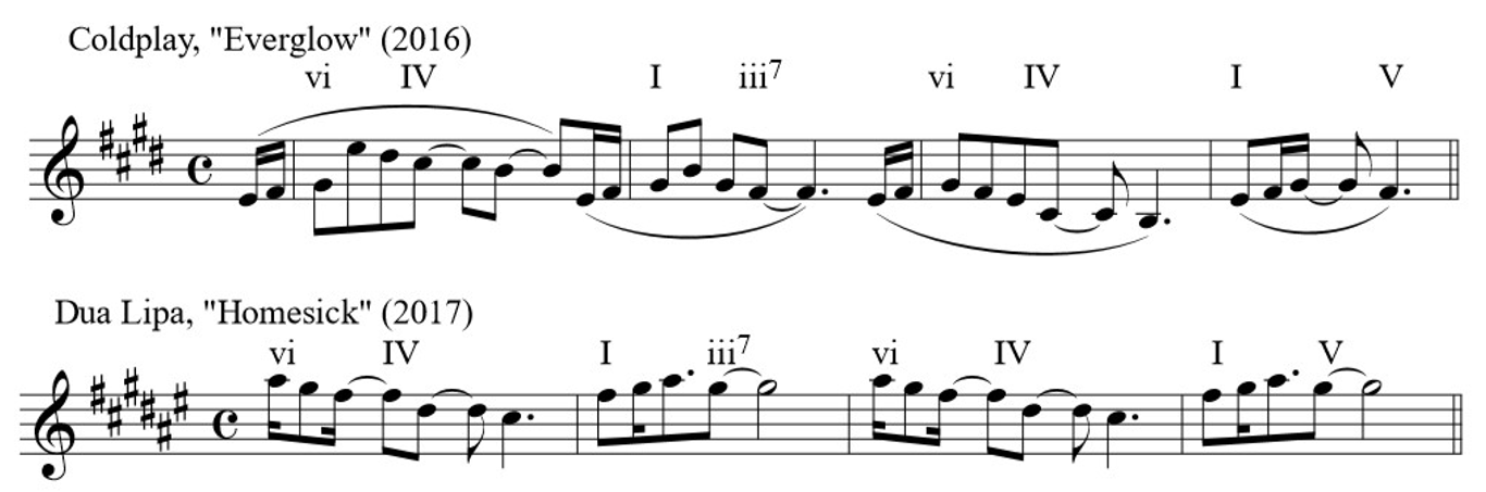 The last of these reported samples highlights an even more striking resemblance between two passages than did the previous example, but once again, I will argue that it is misleading to identify this as a quotation. See in Figure 18 that the piano introduction to Lipa's "Homesick" has obvious similarities to the first bars of Coldplay's "Everglow." Though the key is different, both the chord progression and harmonic rhythm are identical. Furthermore, the respective first and third measures of each feature similar ^6-^5 patterns in the melody, while the even bars include ^3-^2 figures. It might therefore seem reasonable to call it an "interpolation of multiple elements" if not for the fact that Chris Martin of Coldplay is featured on this track. It seems likely that Martin composed and performed both piano riffs. Assuming this is so, it is uncertain if Martin knowingly recycled another of his songs, or if it is simply a matter of different works by the same composer sounding similar due to reliance on the same set of tools and strategies.