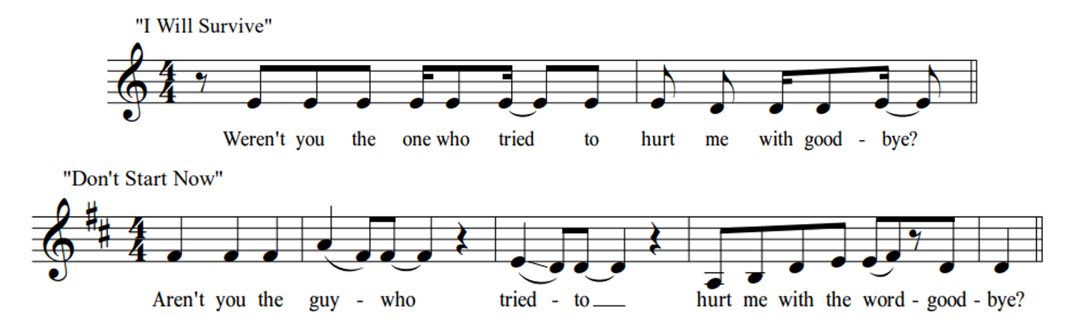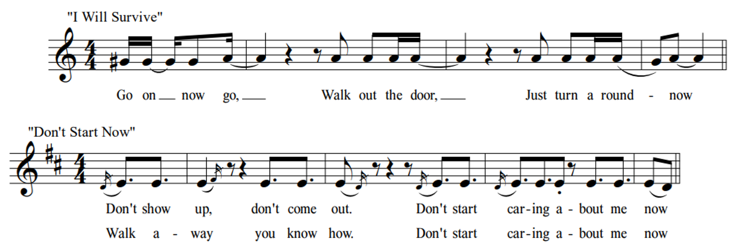 Although not all entries on the music of Dua Lipa are straightforward examples of borrowing, they do provide a helpful overview of the ways in which her songwriting team uses pre-existing music as a starting point for creating a new song. The three reported interpolations discussed above revealed the following practices: 1) paraphrasing a well-known text 2) adopting common disco elements, and 3) re-using a familiar chord progression, transposed up by a step. It so happens that "Don't Start Now," one of Lipa's biggest hits to date (reaching #2 on the UK Singles and US Billboard Hot 100 alike) shows evidence of all three strategies when compared to its apparent model: Gloria Gaynor's "I Will Survive." Both songs are minor mode, mid-tempo disco tunes featuring "jumpy," off-beat (dotted-eighth) clean guitar hits during the verses and violin-led interludes; the lyrics of each present defiant rejection of the advances of a former lover 18 in an intimate, second person address. 19 Beyond these general stylistic similarities, certain passages in "Don't Start Now" are clearly adapted from "I Will Survive." 20 See in Figure 19 that the opening lyrics of Lipa's second verse are paraphrased from Gaynor's. The post-chorus (or "dance chorus") of "Don't Start Now" likewise alludes to "I Will Survive;" see in Figure 20 that both songs feature analogous passages of snappy utterances in a narrow melodic range with lyrics on a similar theme.
