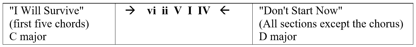 Note that although "I Will Survive" is a rare example of a pop song that is truly in a minor key, the chords are presented here in the relative major for the sake of clear comparison to "Don't Start Now."