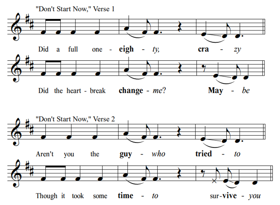 Comparing the chord progression in each song is also revealing. "I Will Survive" features a descending fifths sequence throughout, forming a complete diatonic circle of fifths; most sections of "Don't Start Now," rather, are built upon an ascending fifths sequence. "Don't Start Now" therefore has the same chord progression as "I Will Survive," but backwards (see Figure 21). 21 This observation is intriguing when one considers the first words the of the opening verse: "Did a full 180." 22 Whether or not the writers of this song noticed this theme of reversal, this is an appealing thread to follow on the aesthesic (interpretive) level. Most striking in this regard is the seemingly minor difference in lyrics in the lines shown in Figure 19 above, in which Lipa replaces Gaynor's "one" with the word "guy." Perhaps the reason for this change is simply to continue the rhyme scheme established in the opening verse; compare the di-syllabic rhyme (emphasized by the falling melodic contour) in both verses of "Don't Start Now" in Figure 22. 23 Nevertheless, this subtle textual shift changes the tone of the song profoundly. Gaynor's rhetorical question assigns no gender to the former lover. In fact, the entire song avoids the use of gendered pronouns (addressing an ambiguous "you" for most of the song) vowing to seek out "someone" who will reciprocate her love. Though Lipa retains this genderless address in the chorus ("If you don't wanna see me dancing with somebody"), the mention of a male lover elsewhere in the song erases the queer coding—that is, "does a full 180" in messaging—and, unlike "I Will Survive," it offers no disruption to pop's privileged space of white heteronormativity. 24