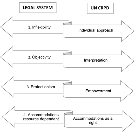 Figure 1. Conflicting perspectives. This figure summarises the differences in perspective between the legal system and the UN CRPD. The legal system is described as inflexible, which is in conflict with the flexibility needed for individual responses to disability. The legal system is concerned with objectivity, in contrast to a more interpretative nature of the UNCRPD. Furthermore, while the UN CRPD aims to empower those with disabilities, the legal system errs of the side of protection of perceived vulnerability. Finally, many in the legal sphere feel the provision of courtroom accommodations is an additional service which should only occur in the event that sufficient resources are available in the legal sphere. However, the UN CRPD views these accommodations as a right, and they therefore should be as part of basic legal services.