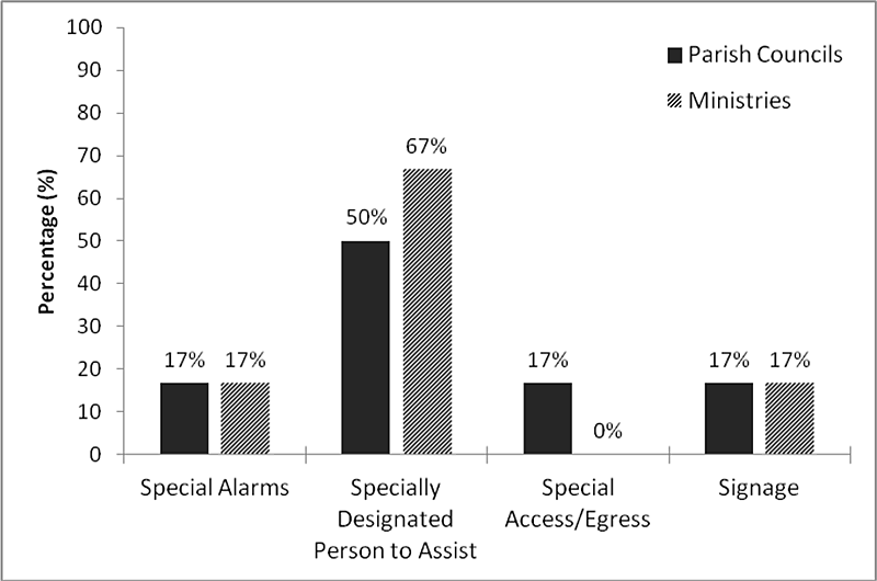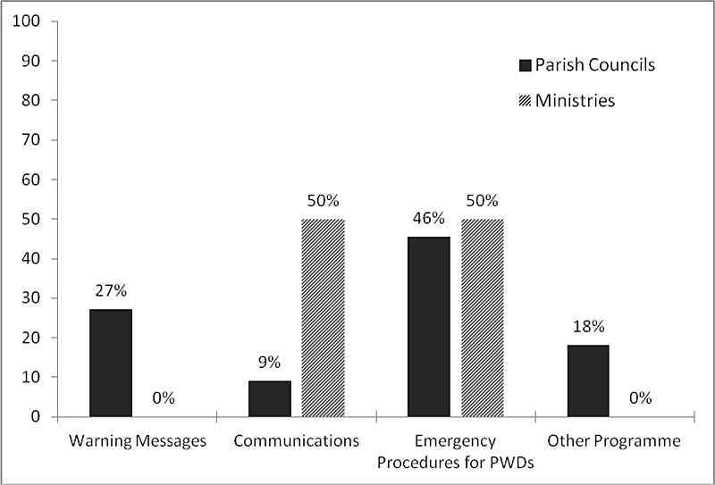 Although PWD-accessible warning messages and precautionary information are sparse on commercial media, the results suggest that the importance of alerting PWDs to potential emergency or disaster situations is appreciated by respondents. Seventeen percent of Parish Councils and 17% of Ministries indicated having Special Alarms in place for PWDs; 50% of Parish Councils and 67% of Ministries reported having specially designated persons to assist PWDs; 17% of Parish Councils indicated special access/egress for PWDs but no Ministries had this in place; and 17% of Parish Councils and 17% of Ministries had special signage in place for PWDs during emergencies (see Figure 5). Parish Councils and Ministries reported warning systems or procedures for PWDs. Systems in place at the parish level include designated members of CERTs being given responsibility for warning PWDs, strobe lights in offices and one Parish Disaster Committee reported using an umbrella organisation for PWDs to assist with alerting and warning. Ministries reported that fire wardens and monitors have been assigned responsibility for warning PWDs. However, these measures are not widespread enough to benefit the majority of PWDs.