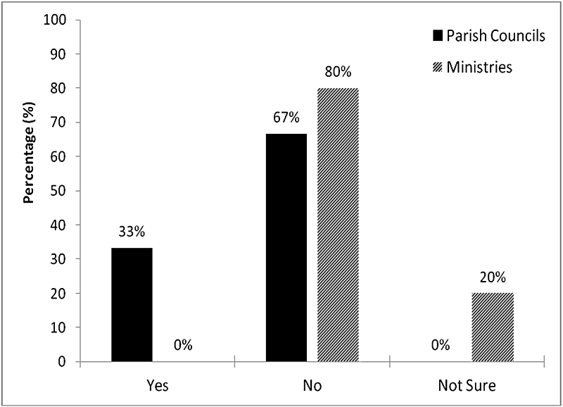 National and local government entities were asked about the inclusion of PWDs on DRM Planning Committees, about special roles accorded PWDs during times of emergency, and to offer recommendations with respect to facilitating PWDs in the workplace. With respect to the inclusion of PWDs in DRM Planning and Preparedness, none of the Government Ministries reported that PWDs are included on DRM Planning Committees, rather, 80% indicated that no PWDs were included on DRM Planning Committees and 20% indicated that they were not sure. Four of the Ministries also indicated that PWDs were not given any special roles during times of emergencies. Amongst the Parish Councils, however, 33% indicated that PWDs are included on Planning Committees whilst 67% indicated that they were not (Figure 2). Nine of the Councils, though, stated that PWDs were not accorded any special roles during emergencies whilst three said that they were uncertain if any special roles were allocated to PWDs during these times.